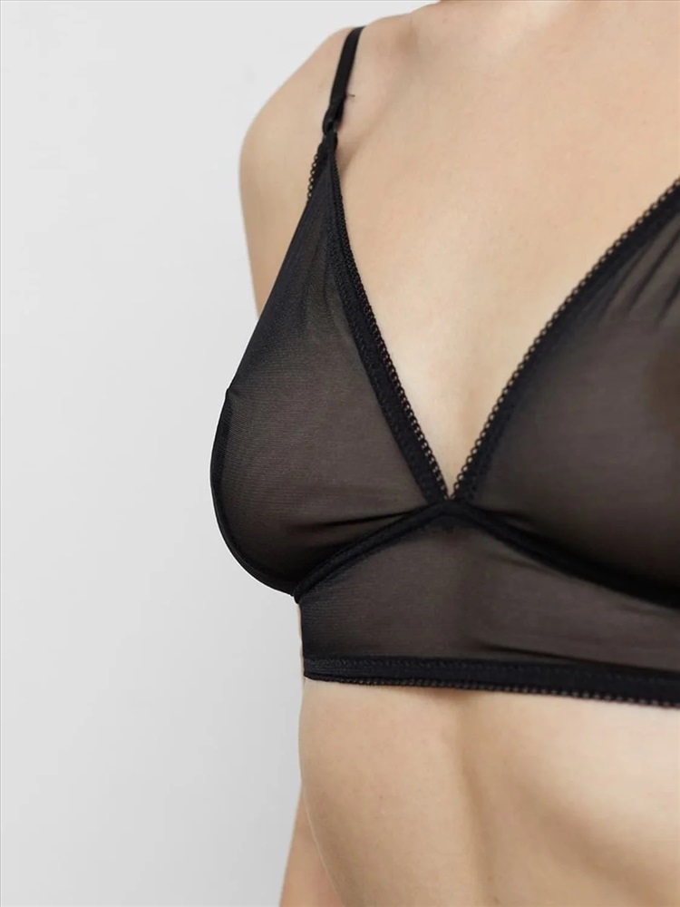 Интригующий бюстгальтер с мягкими треугольными чашками с вытачкой. Выполнен из ультралегкого полупрозрачного сетчатого полотна. Отсутствие косточек дарит полный комфорт. Срезы чашек и стан обработаны тесьмой. Место соединения чашки и стана обработано обтачкой. Очаровательно!
