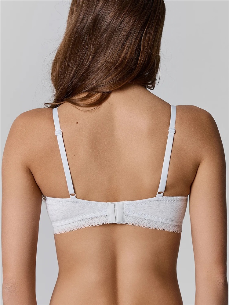 Бюстгальтер женский, t-shirt. С жесткими формованными чашками без каркасов. Чашки из хлопка, с вытачками. По линии декольте и по пройме чашки обтачаны полотном. Отрезные бочки из хлопка. В боковых швах пластины. Верхний срез бочка обработан жесткой тесьмой. По нижнему среза стана настрочена декоративная тесьма с жесткой тесьмой с изнаночной стороны. Бретель с регулировкой по размерам. Застежка двойная.
