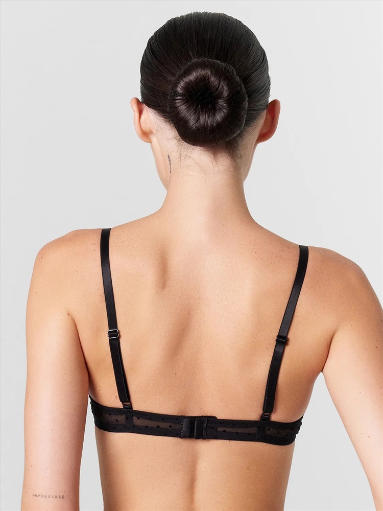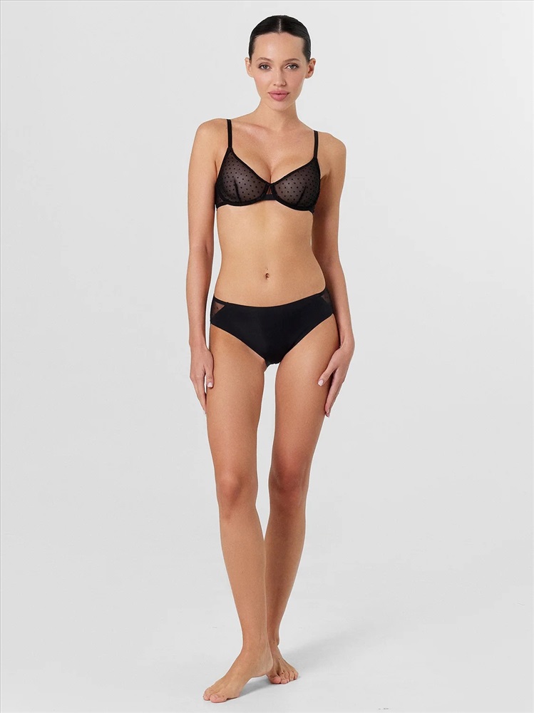 Бюстгальтер женский с мягкой чашкой, на каркасах, из эластичной сетки с флоком. Чашка с вытачкой, с выступом. Верхний срез чашки обработан швом вподгибку с эластичной тесьмой внутри. Ластовица выполнена из бретельной тесьмы 15 мм (SWE3-15). Пройма, верхний и нижний срезы стана обработаны в два приема эластичной тесьмой.