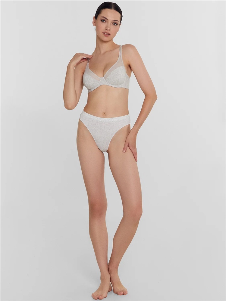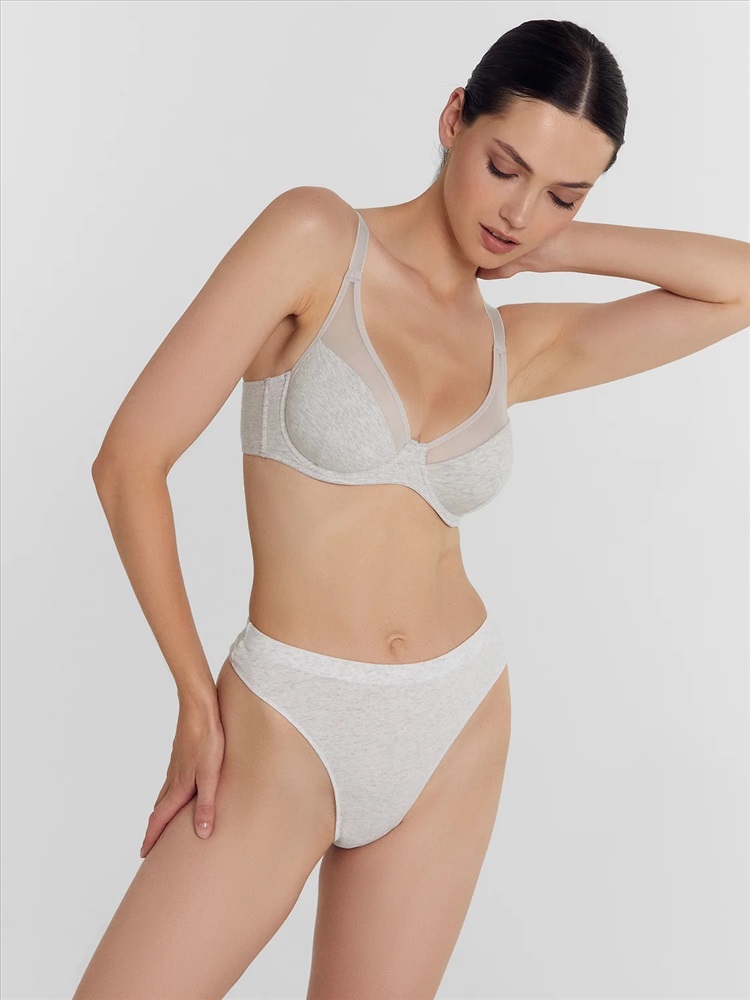 Бюстгальтер макси из трикотажного кулирного полотна с отделкой эластичной сеткой, каркас 50 тип. Чашка с горизонтальным рельефом, верхняя деталь выполнена из сетки, нижняя деталь с вытачкой из кулирного полотна на подкладке из кулирного полотна. Верхний и боковой срезы чашки окантованы эластичной тесьмой.