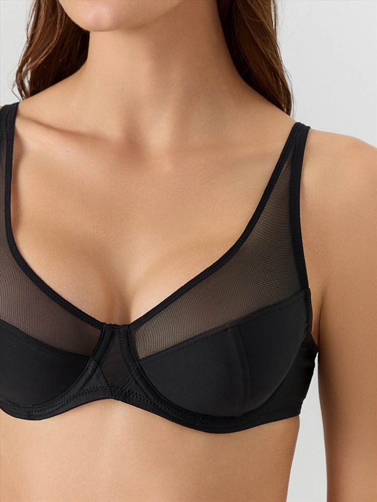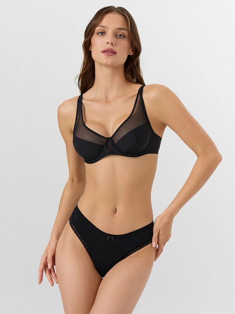 Бюстгальтер с мягкой чашкой из микрофибры с отделкой эластичной сеткой, каркас 47 тип. Чашки с тройным членением: верхняя деталь из сетки, нижние-из микрофибры, на подкладке из эластичной сетки. Верхний срез чашки обработан эластичной тесьмой.