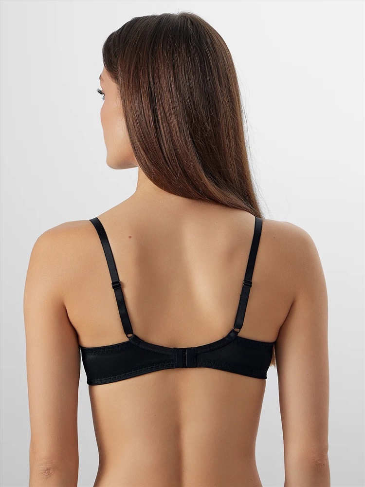 Бюстгальтер с мягкой чашкой из эластичного кружева и микрофибры, на каркасах 20 тип. Чашка с двойным членением. Нижняя деталь чашки на подкладке из эластичной сетки. С изнаночной стороны верхней части чашки стоит уплотнитель из эластичной сетки на уровне бретелей. По верхнему срезу чашки с изнаночной стороны настрочена эластичная тесьма (жилка тканая WT4-6, девсел 13460W).