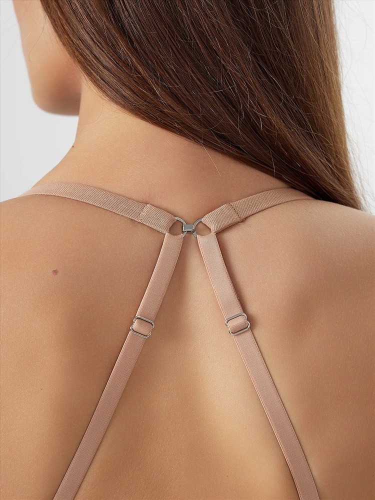 Бретели по размерам 10 мм и 15 мм по размерам регулируются по длине сзади. Бретель с надставкой из основного полотна с эл тесьмой (жесткая б/зуба WTE-10 , WTE1-15, девсел 487W) внутри. Надставка соединяется с бретельной тесьмой 10 мм и 15 мм по размерам (SWE2, девсел 1879W) через кольцо на одной бретели и через застежку-кольцо на другой бретели.
