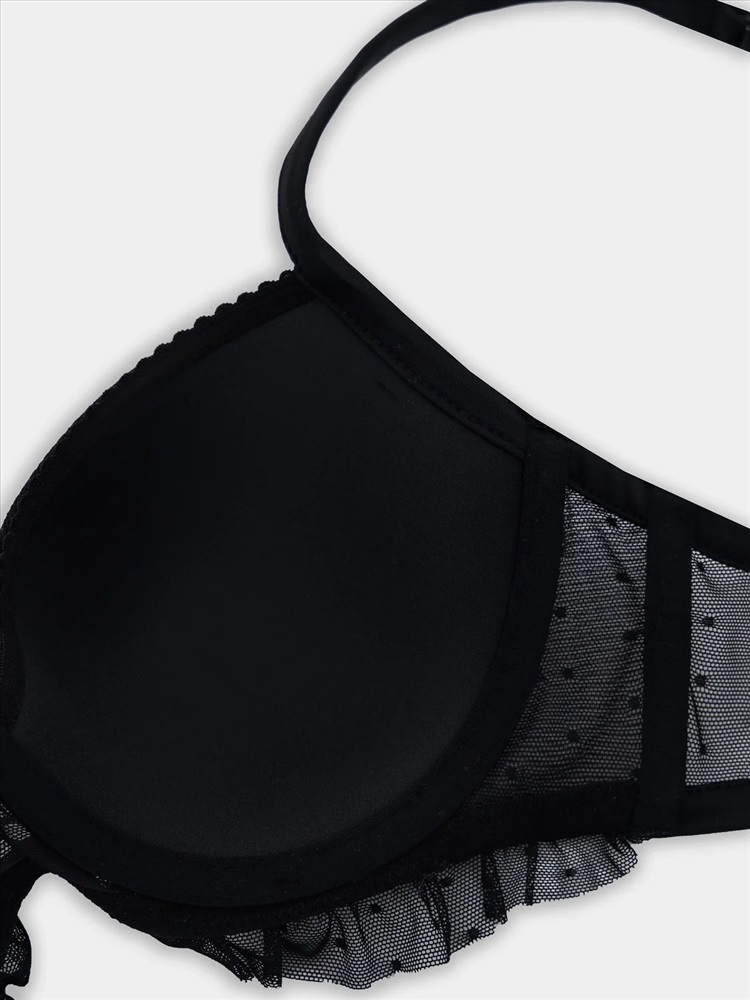 Бюстгальтер тишот с формованными чашками (CN-53.16m), на стане, на каркасах (2 ТИП), из кружевного полотна в горошек, декорирован микрофиброй. Верхняя деталь чашки с вытачкой из кружевного полотна, по верхнему срезу с изаночной стороны декорирована эл тесьмой 8 мм (жесткая с зубом WTE1-8, девсел 558W) . Ластовица и деталь стана из кружевного полотна, на подкладке из монокапрона. Нижний срез стана обработан эл тесьмой 10 мм (жесткая без зуба WTWE1-10, девсел 487W), и декорирован рюшей из круж полотна с сырым срезом. По каркасам с лицеdвой стороны настрочены декоративные обтачки из микрофибры.