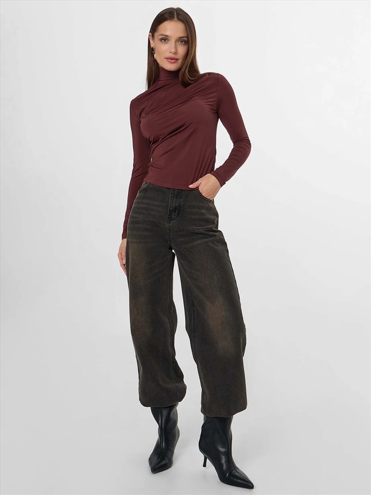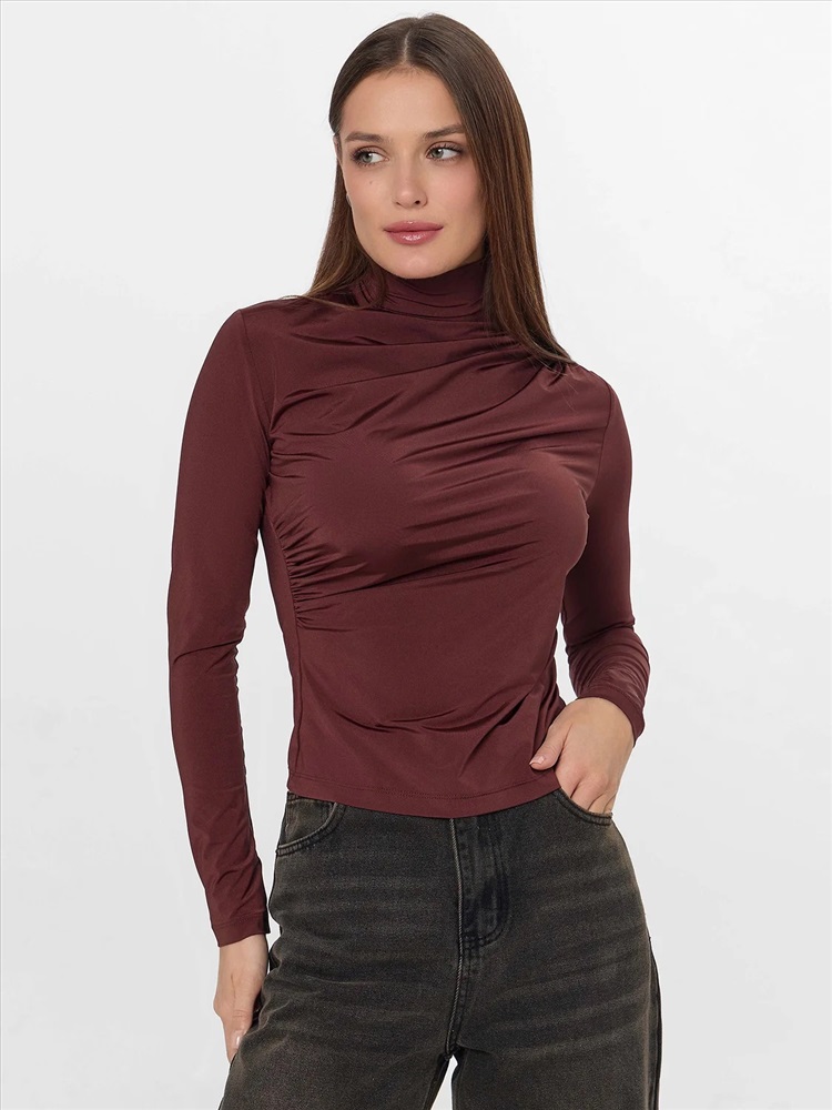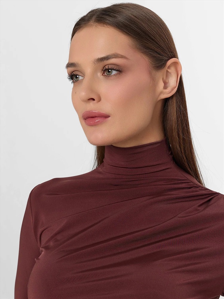 Перед и спинка изделия выполнены как одно целое, что создает гладкую поверхность без лишних швов. Изюминкой модели является изящная драпировка-сборка, заложенная сбоку спереди и в области плеча. Этот элемент добавляет женственности, создавая мягкие живые складки. Высокий воротник-стойка нежно обрамляет горло, придавая образу строгость и законченность.