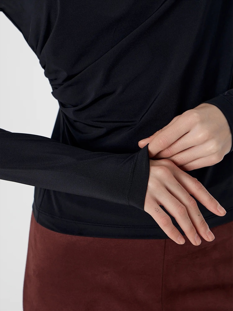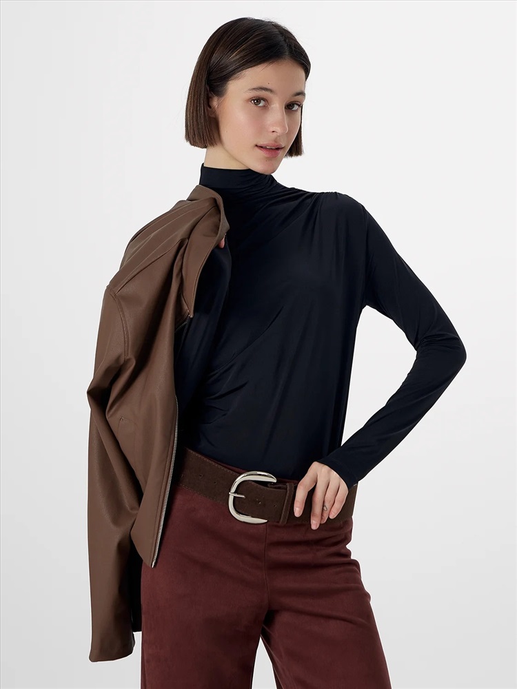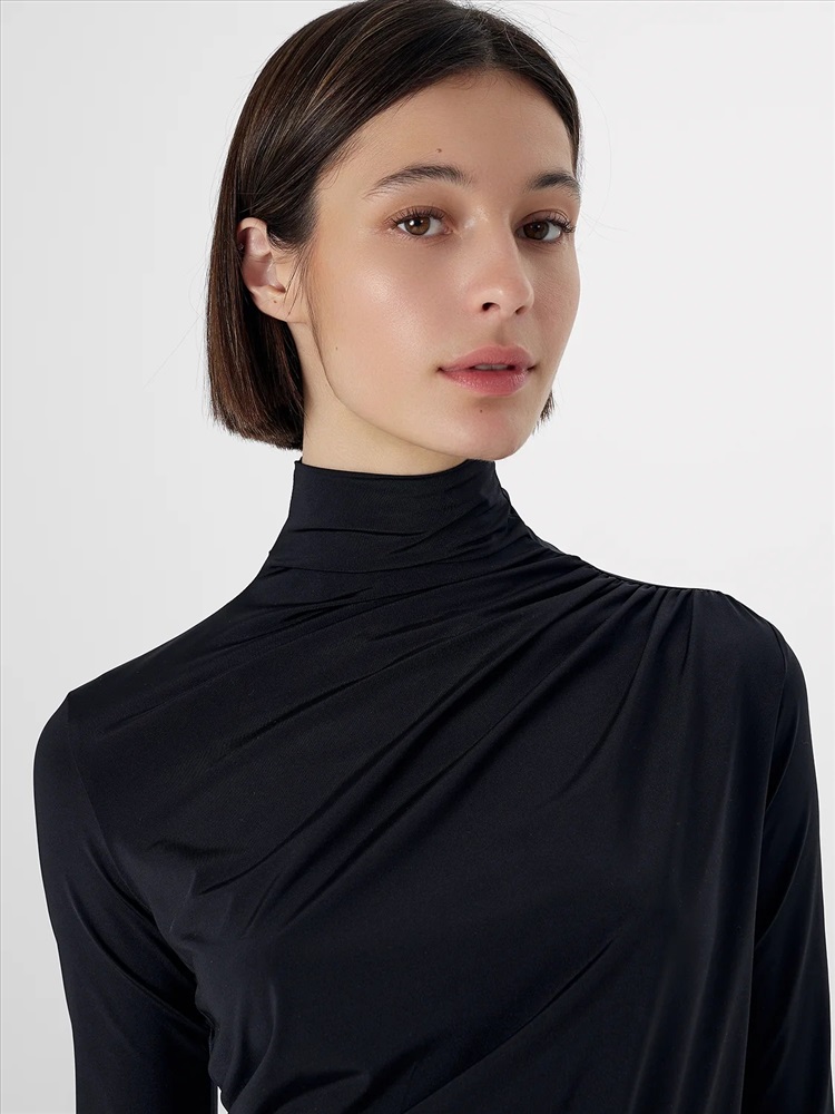 Перед и спинка изделия выполнены как одно целое, что создает гладкую поверхность без лишних швов. Изюминкой модели является изящная драпировка-сборка, заложенная сбоку спереди и в области плеча. Этот элемент добавляет женственности, создавая мягкие живые складки. Высокий воротник-стойка нежно обрамляет горло, придавая образу строгость и законченность.