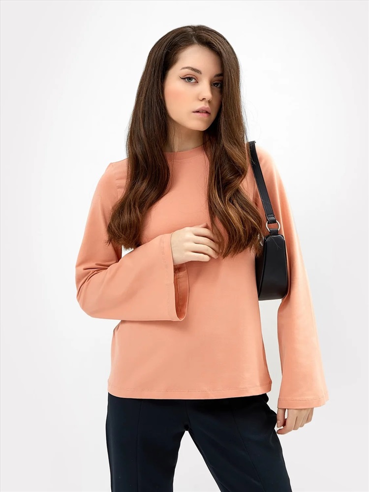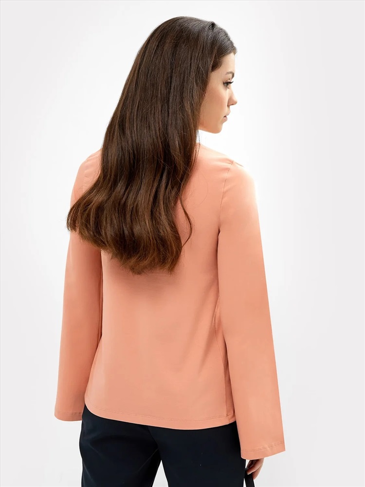 Джемпер женский из кулирного полотно с эластаном. Перед и спинка цельнокроенные, с облеганием в плечевом поясе и по груди, и с расклешением к низу изделия.