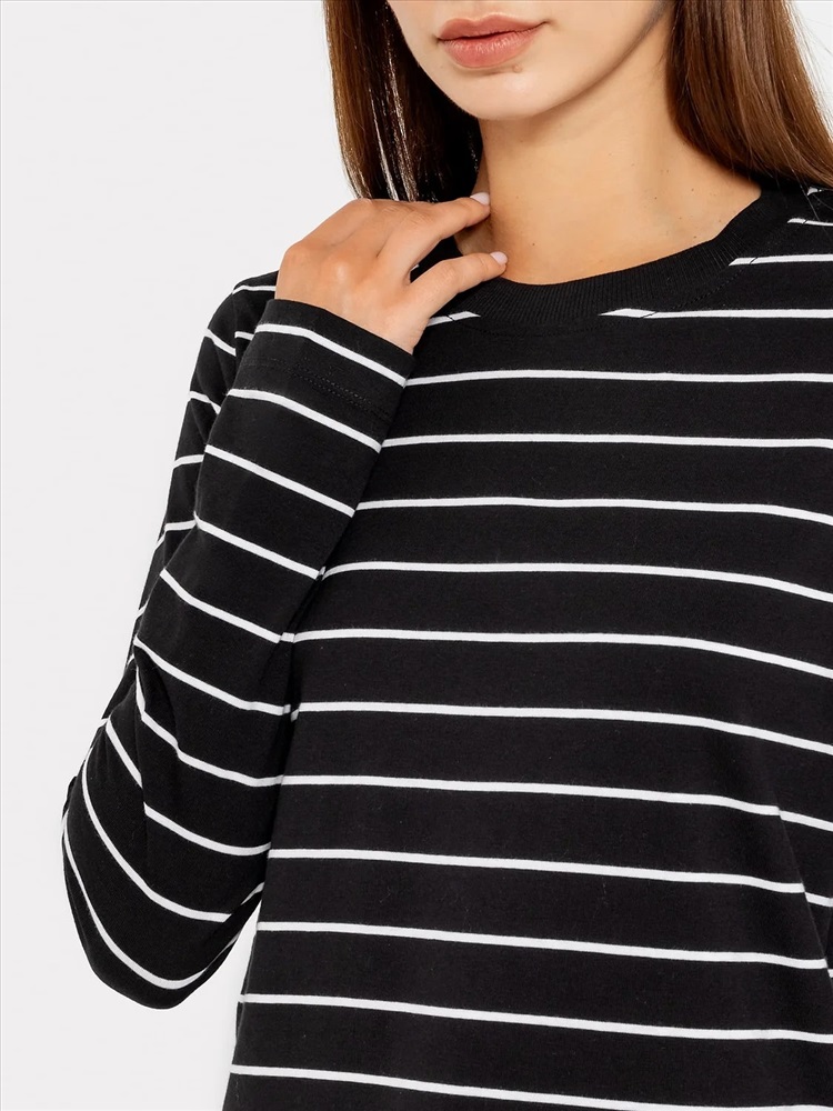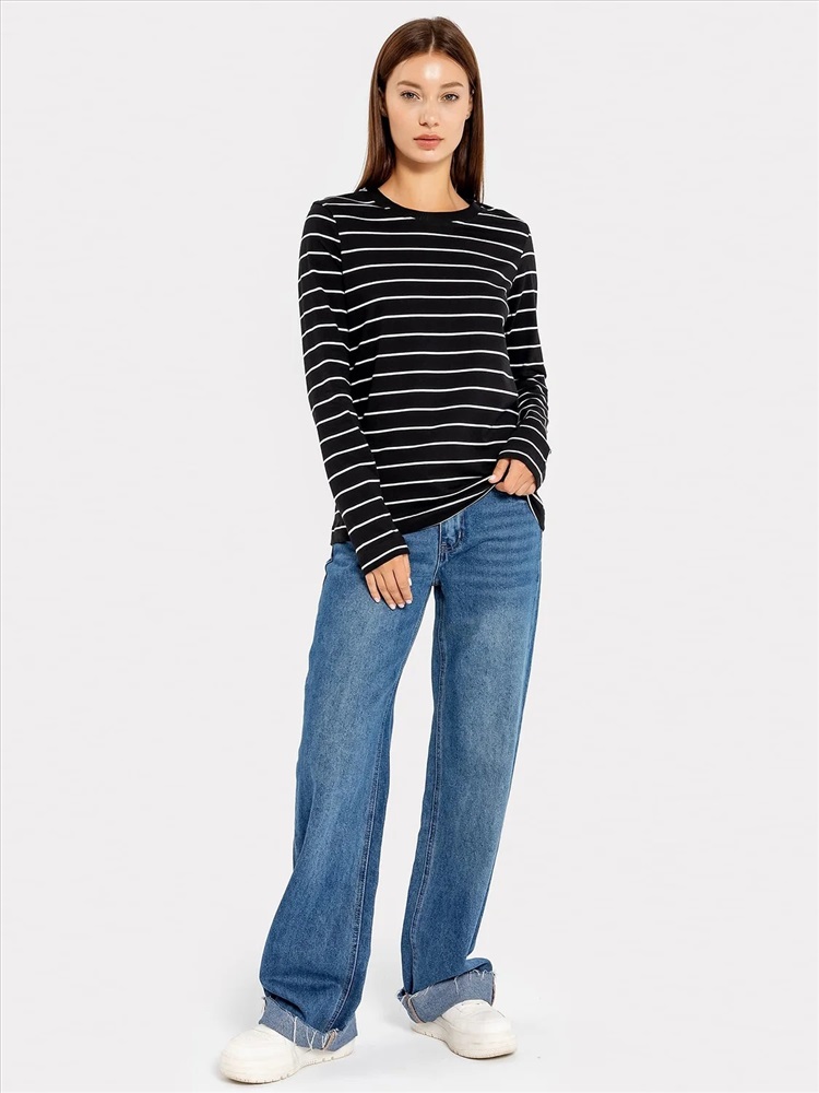 Джемпер женский прямого силуэта из трикотажного полотна кулирка. Горловина круглой формы, широкая обтачка из рибаны. Рукав втачной, длинный. Подгибки низа и рукава широкие.