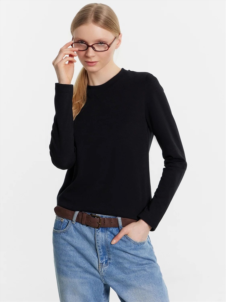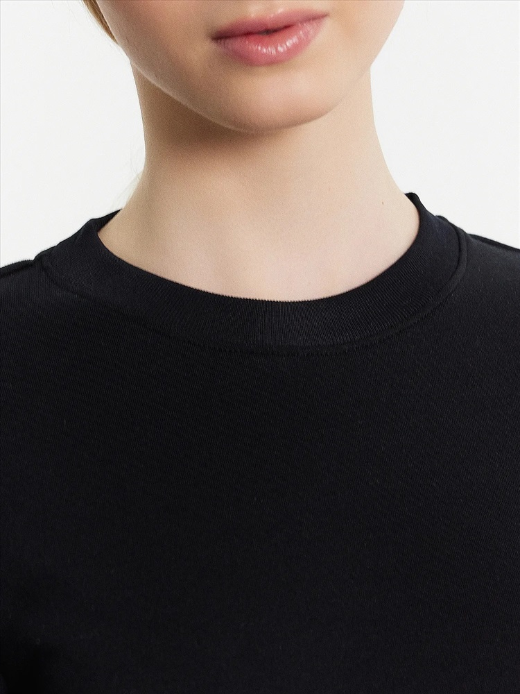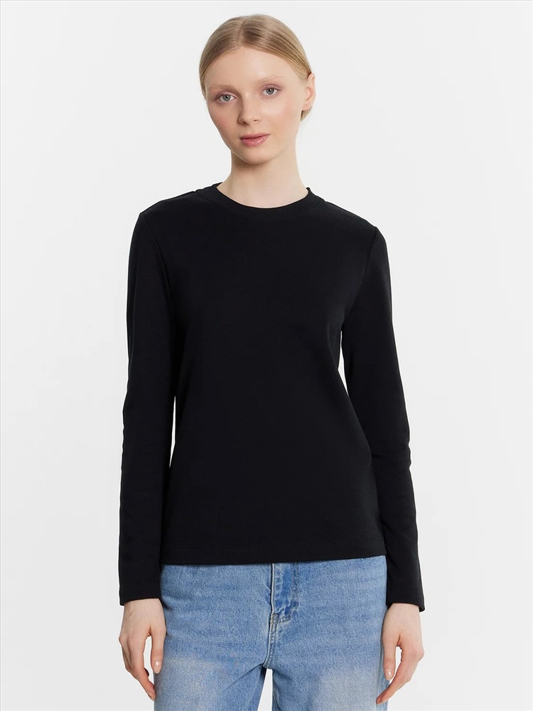 Джемпер женский прямого силуэта из трикотажного полотна кулирка. Горловина круглой формы, широкая обтачка из рибаны. Рукав втачной, длинный. Подгибки низа и рукава широкие.
