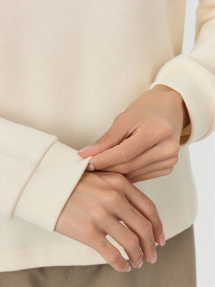 Спущенная линия плеча и длинные рукава с манжетами добавляют образу расслабленности, позволяя чувствовать себя свободно и уютно. Материал устойчив к износу, не теряет форму после стирок и остается таким же мягким даже при длительном использовании.