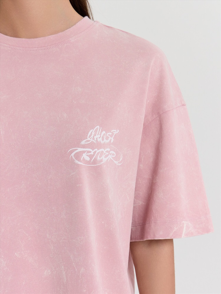 Футболка силуэта оверсайз из трикотажного полотна кулирка. Горловина круглой формы, обтачка горловины из рибаны. Шов горловины спинки закрыт бейкой из основного полотна.