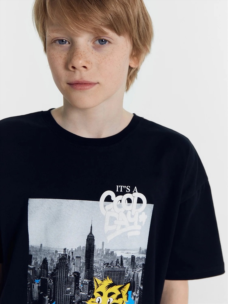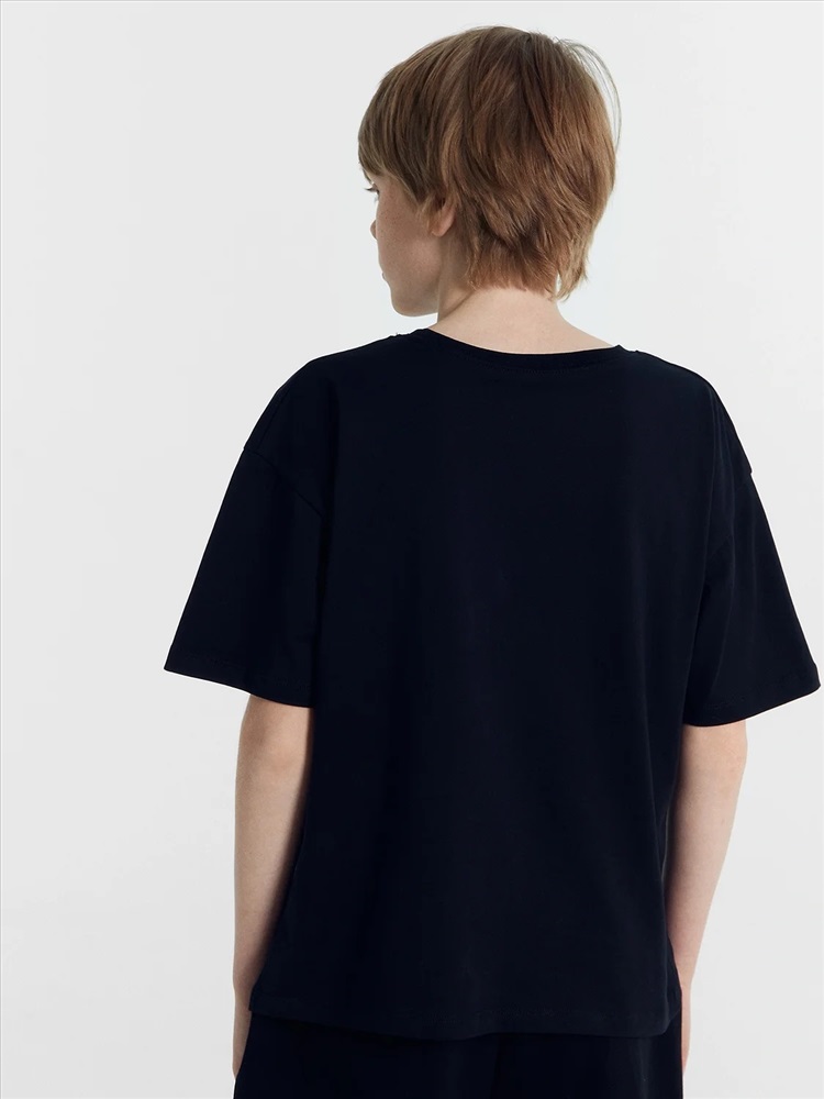 Футболка свободного силуэта из хлопковой трикотажной кулирки. Длина до середины бедер. Рукава короткие. Горловина круглой формы, с обтачкой из рибаны. Спущенная линия плеча дарит особый комфорт. Стильно и удобно!