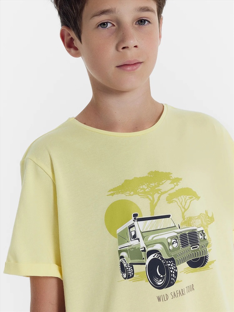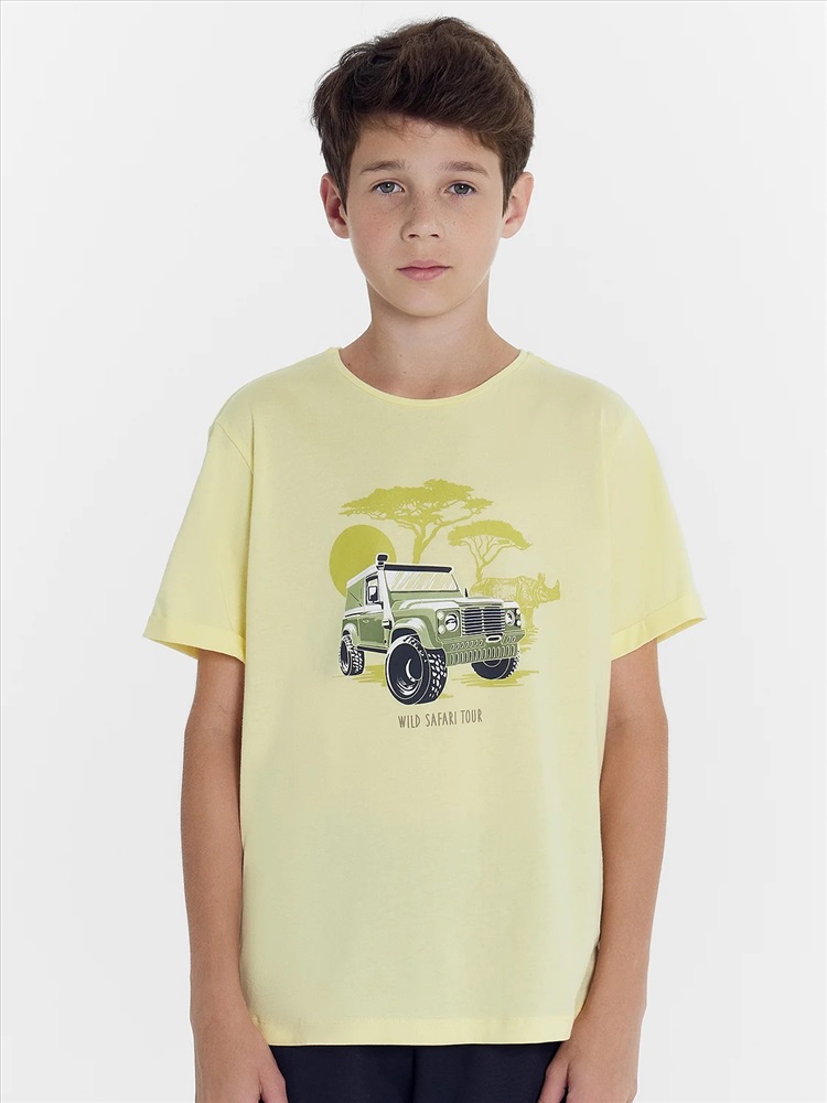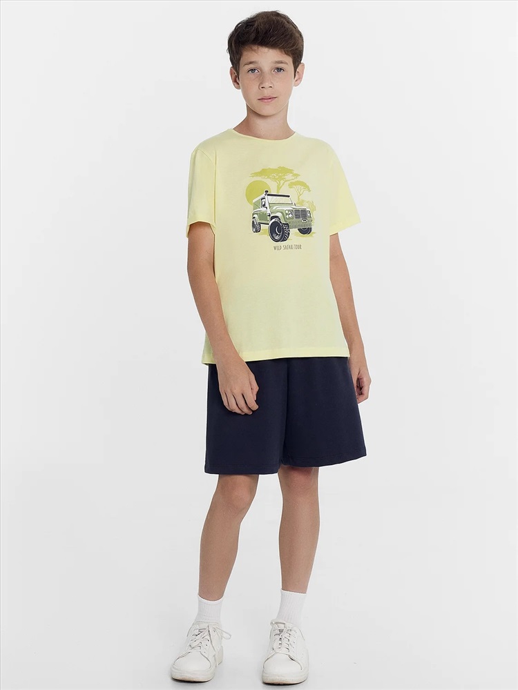 Футболка прямого силуэта. Перед и спинка цельнокроеные. Рукава втачные короткие. Нижние срезы рукавов с отворотами. Горловина круглой формы, обтачка из основного полотна. Шов притачивания обтачки закрыт бейкой из основного полотна. Низ изделия обработан на 2-х игольной плоскошовной машине швом в подгибку.
