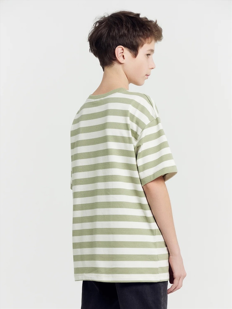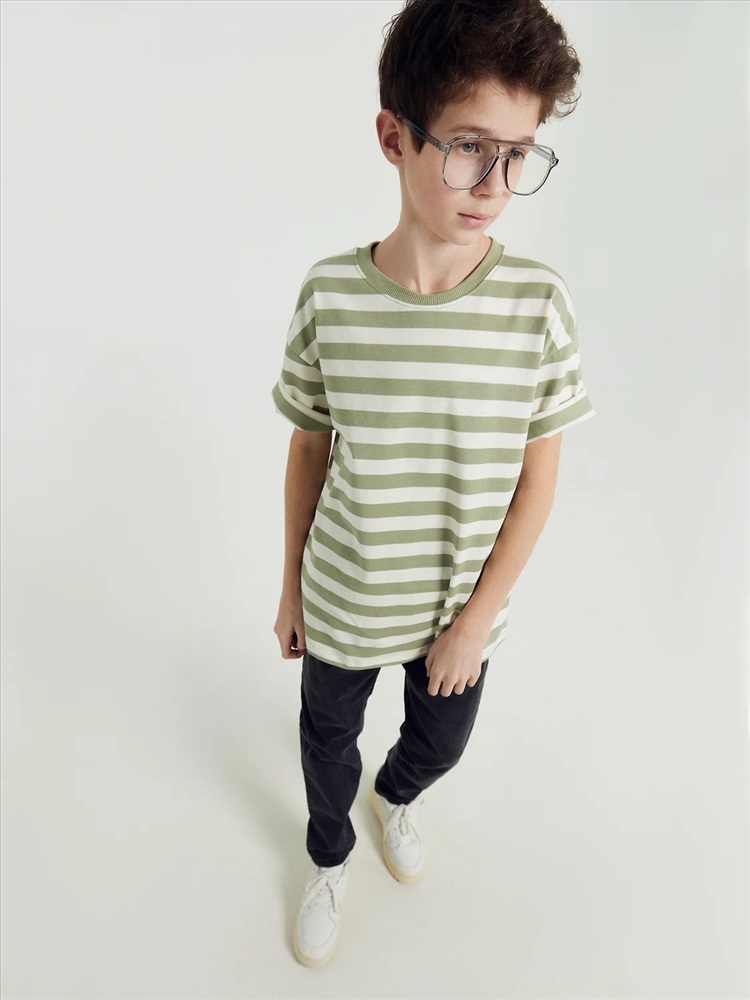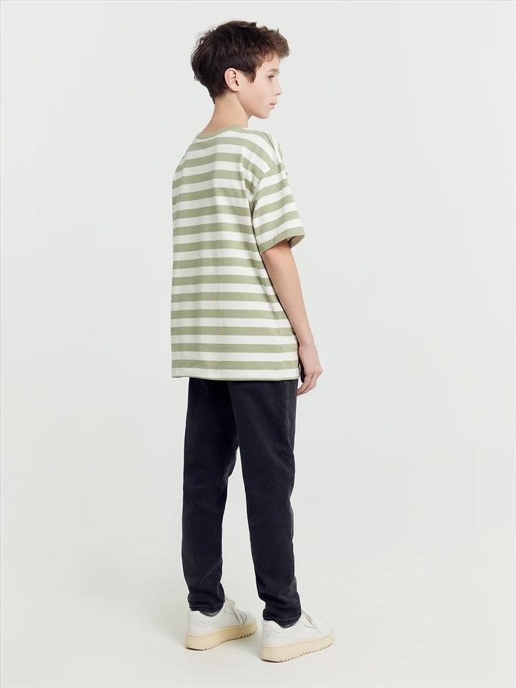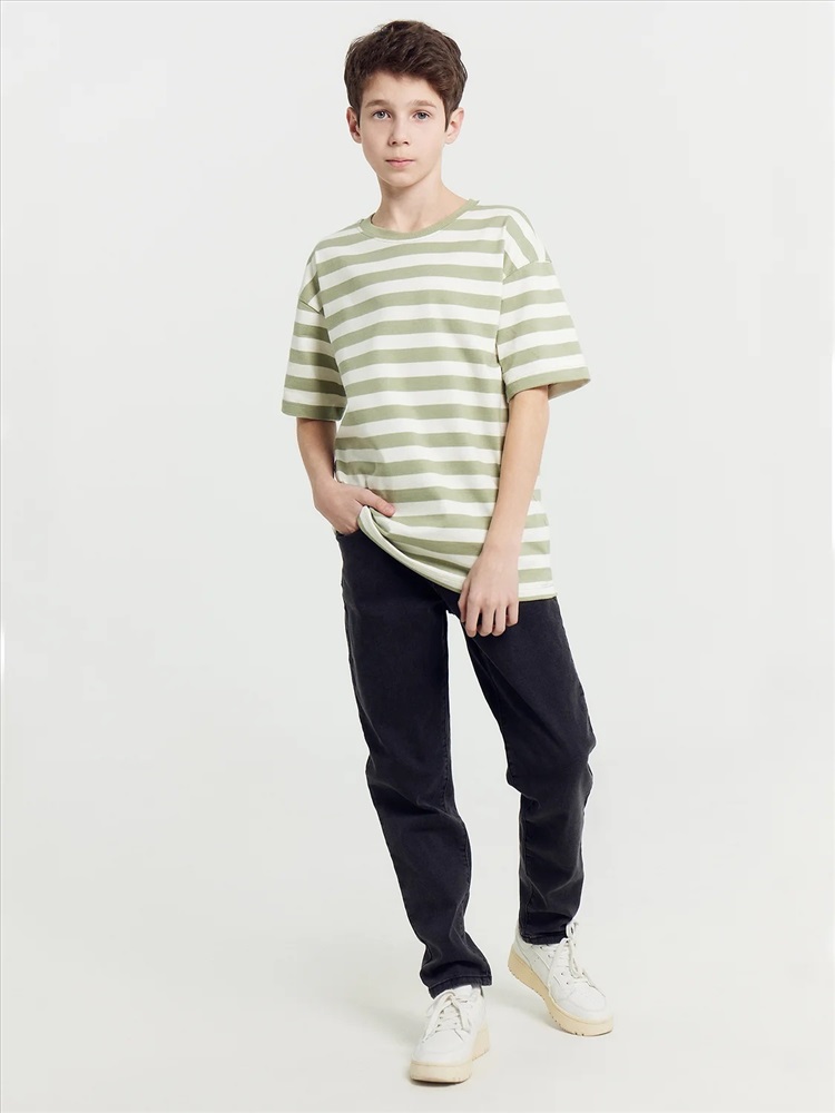 Футболка свободного силуэта. Перед и спинка цельнокроенные. Длина до середины бедра. Рукав втачной, короткий, линия плеча спущена. Горловина круглой формы, обтачка из трикотажного полотна рибаны 2*2. Низ изделия и рукваов обработан на 2-х игольной плоскошовной машине швом в подгибку.
