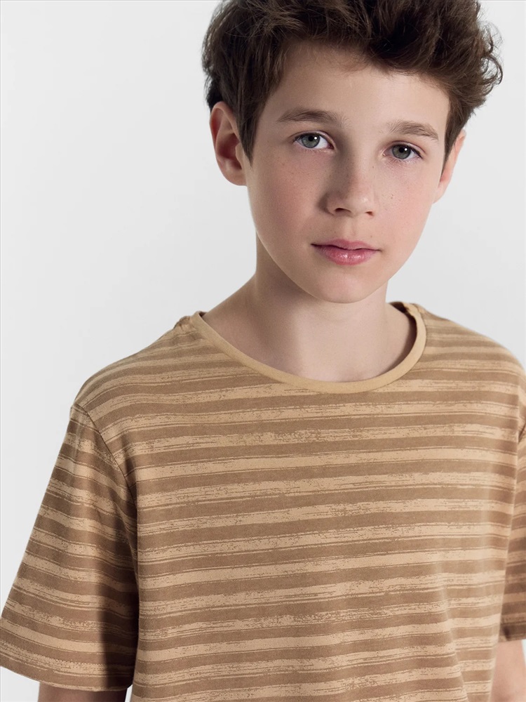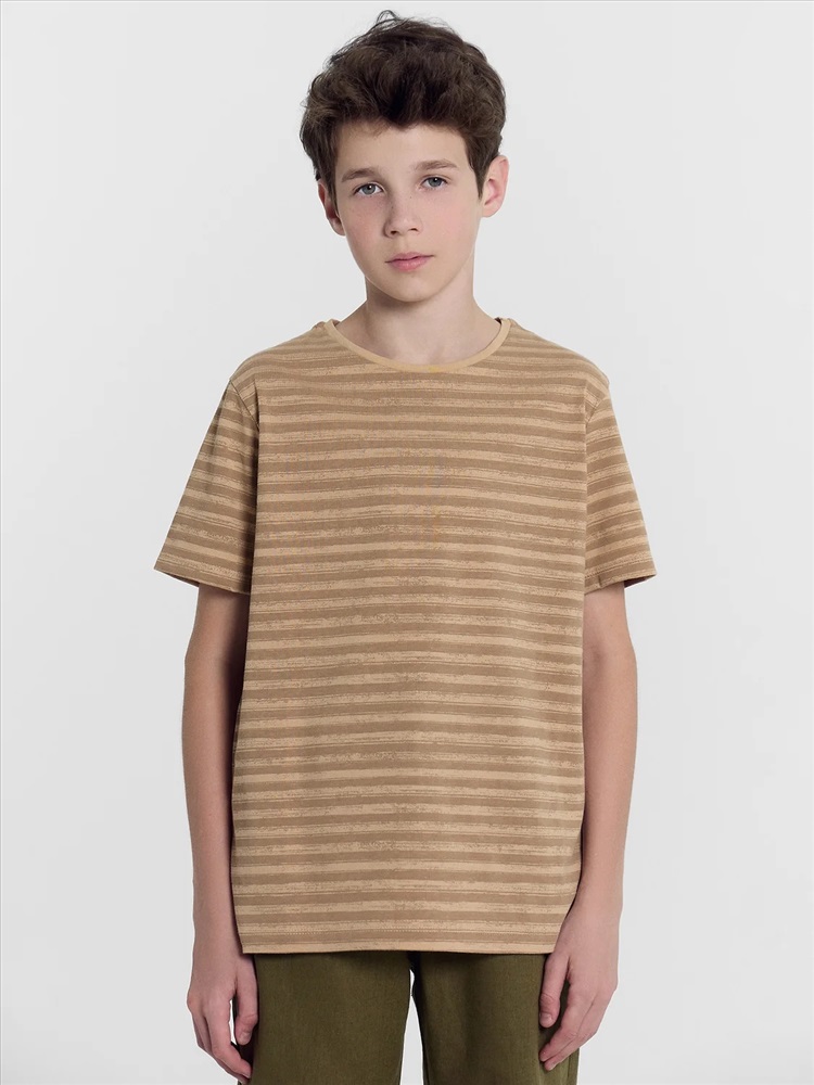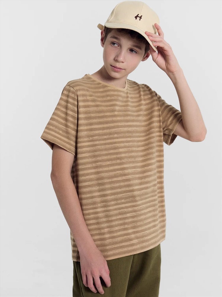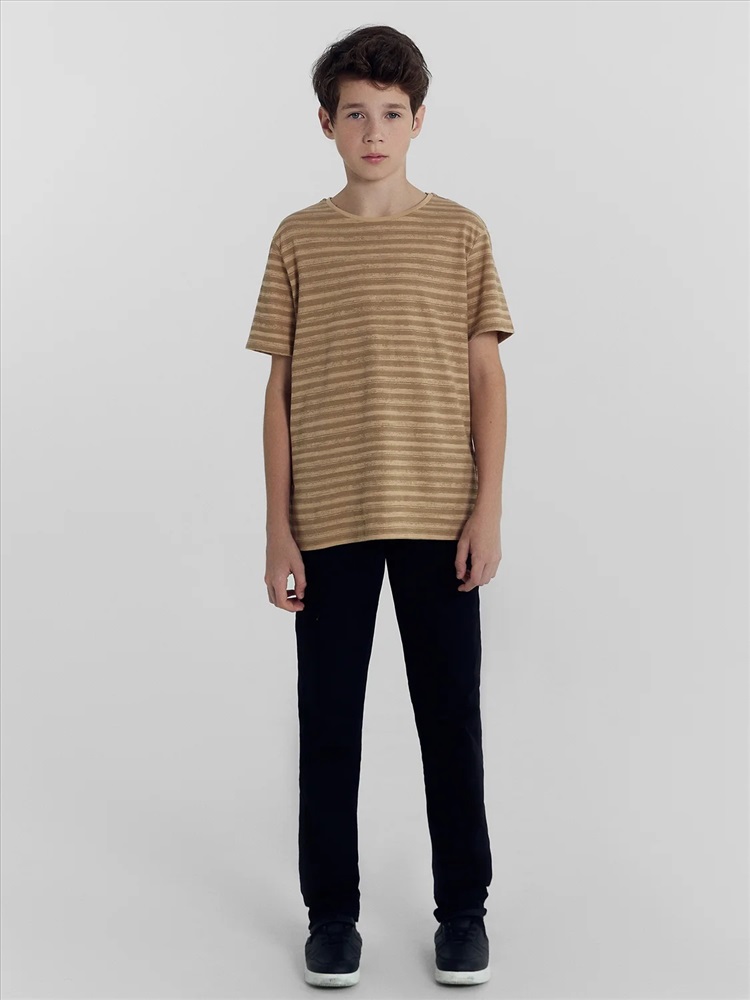 Футболка прямого силуэта. Перед и спинка цельнокроеные. Рукава втачные короткие. Горловина круглой формы, обтачка из основного полотна. Шов притачивания обтачки закрыт бейкой из основного полотна. Низ изделия и рукавов обработаны на 2-х игольной плоскошовной машине швом в подгибку.