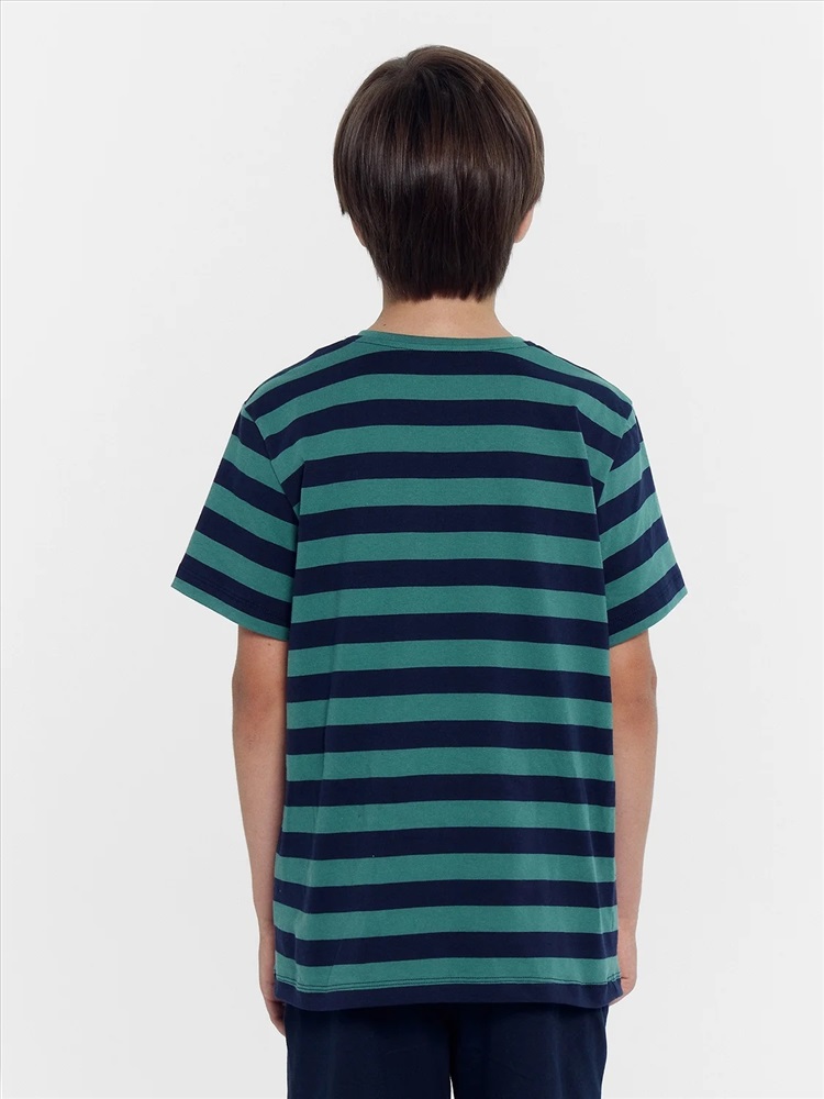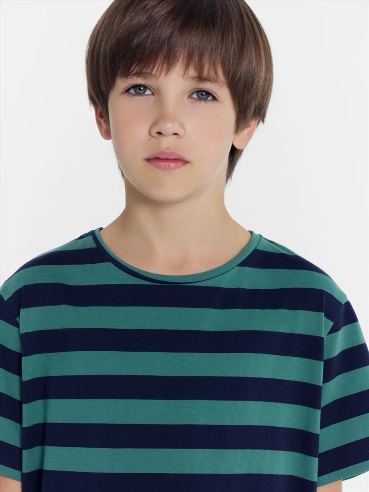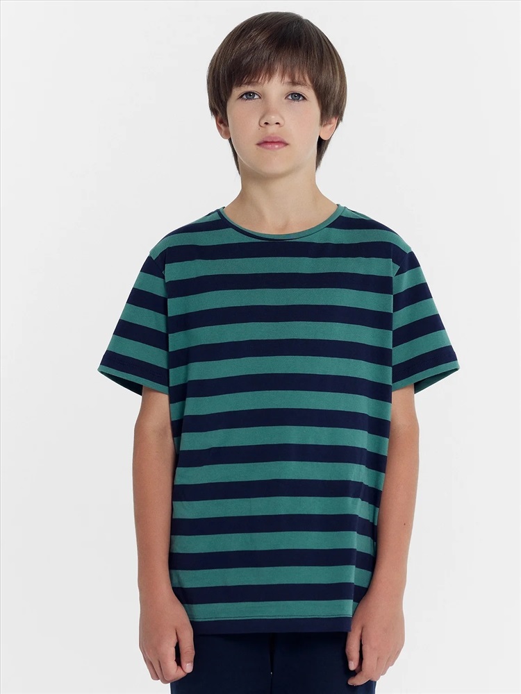 Футболка прямого силуэта. Перед и спинка цельнокроеные. Рукава втачные короткие. Горловина круглой формы, обтачка из основного полотна. Шов притачивания обтачки закрыт бейкой из основного полотна. Низ изделия и рукавов обработаны на 2-х игольной плоскошовной машине швом в подгибку.