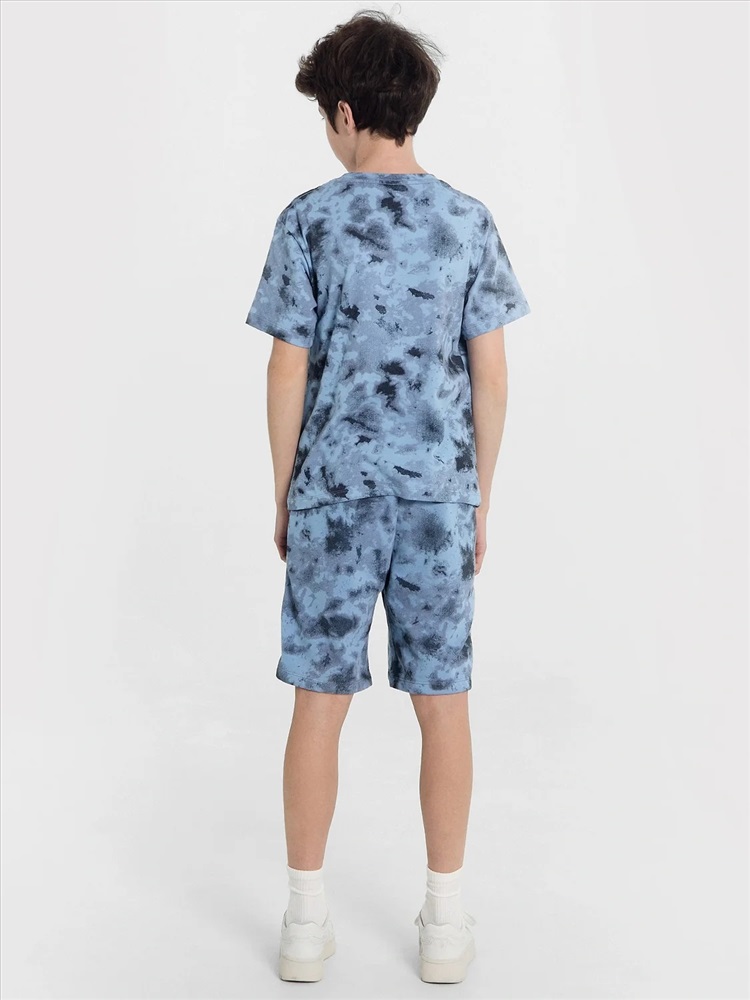 Футболка верхняя прямого силуэта. Перед и спинка цельнокроенные. Рукава втачные короткие. Линия плеча спущена. Горловина круглой формы, обтачка из трикотажного полотна рибаны 1*1. Шов втачивания рибаны по спинке закрыт бейкой из основного полотна. Низ футболки и рукавов обработан на 2-х игольной плоскошовной машине швом в подгибку.