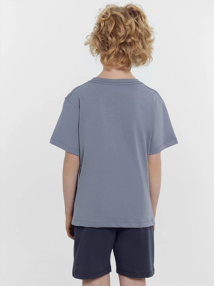 Футболка верхняя прямого силуэта. Перед и спинка цельнокроенные. Рукава втачные короткие. Линия плеча спущена. Горловина круглой формы, обтачка из трикотажного полотна рибаны 1*1. Шов втачивания рибаны по спинке закрыт бейкой из основного полотна. Низ футболки и рукавов обработан на 2-х игольной плоскошовной машине швом в подгибку.
