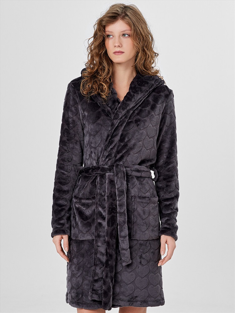 Серый женский халат с узором сердечек — это уют и нежность для вашего отдыха. Модель прямого силуэта ниже колен выполнена из мягкого полиэстера, который обеспечивает легкость, простоту ухода и сохранение формы после стирки.