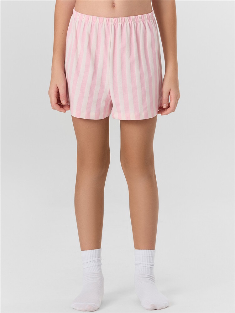 Шорты слегка расширены к низу. Пояс цельнокроеный с эластичной тесьмой внутри. Низ застрочен швом в подгибку.