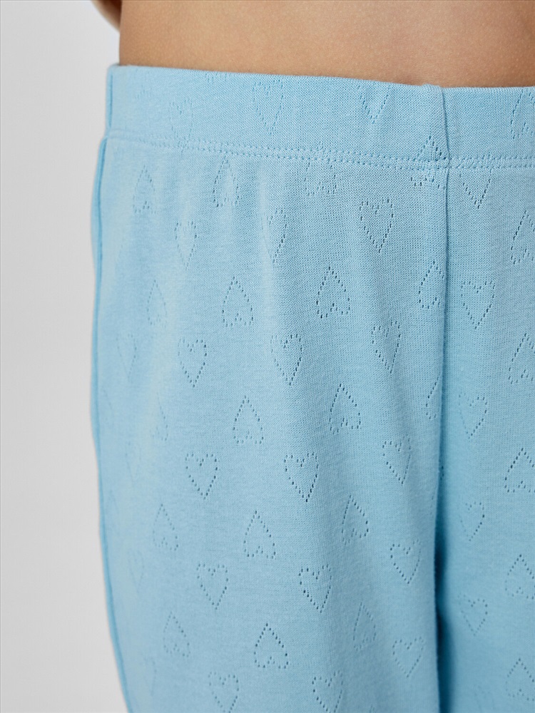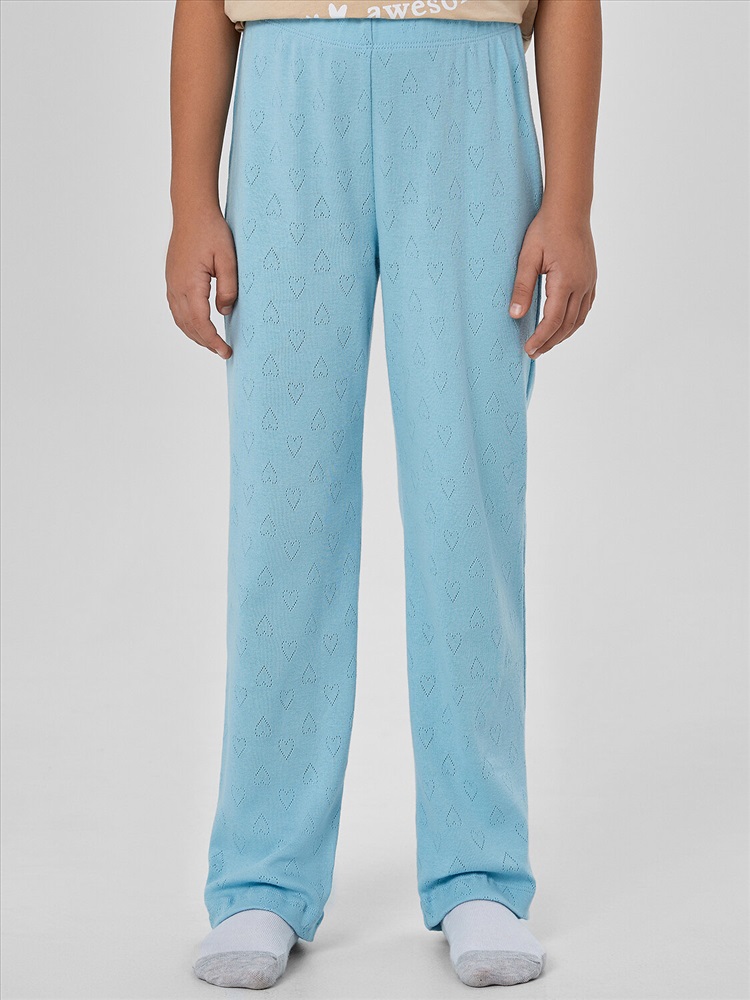 Лонгслив с круглой горловиной и длинными рукавами обеспечивает удобство и свободу движений во время сна или игр перед сном. Брюки прямого кроя на мягком широком поясе с эластичной резинкой не давят на талию и надежно фиксируются, не сползая при активном движении. Оба предмета изготовлены из эластичной рибаны, которая хорошо тянется, сохраняет форму после множества стирок и позволяет коже дышать.