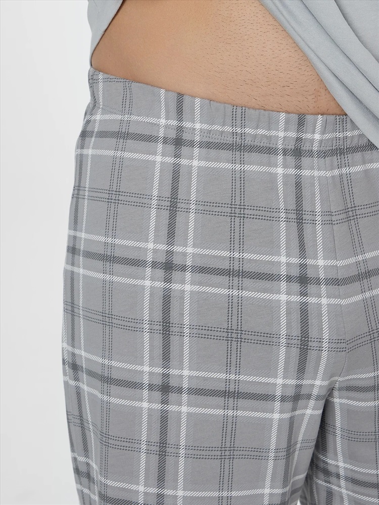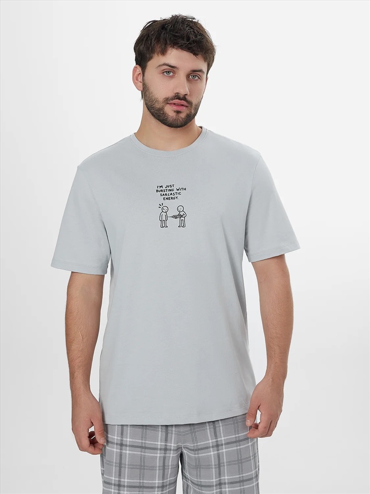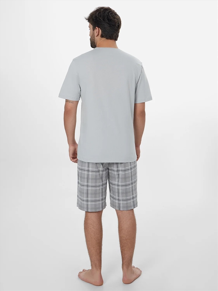 Пижама состоит из футболки и шорт. Футболка прямого силуэта. Горловина округлой формы обработана обтачкой из рибаны. Шов втачивания обтачки по спинке закрыт бейкой из основного полотна. Нижние срезы футболки и рукавов обработаны швом вподгибку.