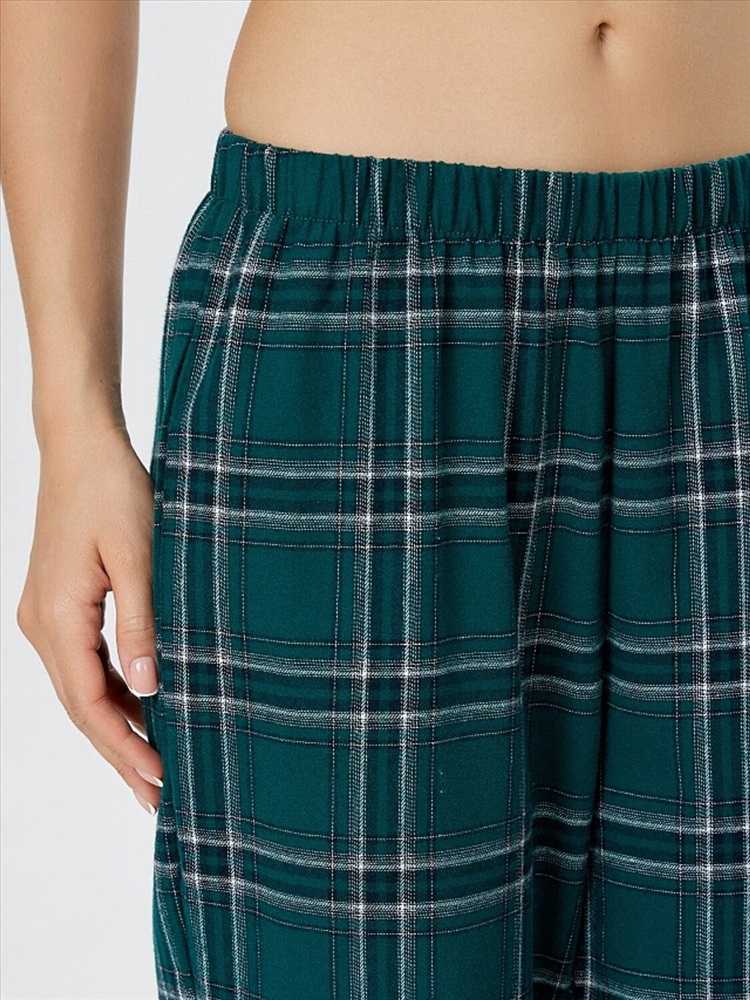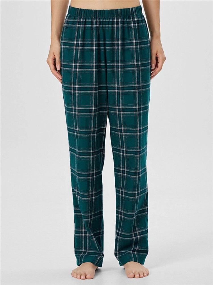 Брюки с широким эластичным поясом мягко сидят на талии, не оставляя следов, а клетчатый рисунок придает образу теплоту и домашний шарм. Этот комплект подойдет для сна, утреннего кофе или отдыха с книгой — он сочетает практичность и стиль.