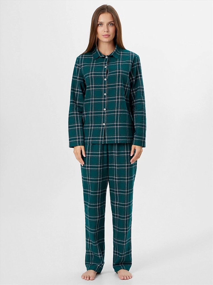 Пижама женская домашняя в клетку — это уют и гармония для вашего отдыха. Набор из рубашки и брюк выполнен из хлопка, который дарит коже нежность, воздух и комфорт. Свободный силуэт рубашки с заниженной линией плеч и длинными рукавами не сковывает движений, а застежка на пуговицы добавляет классическую элегантность.
