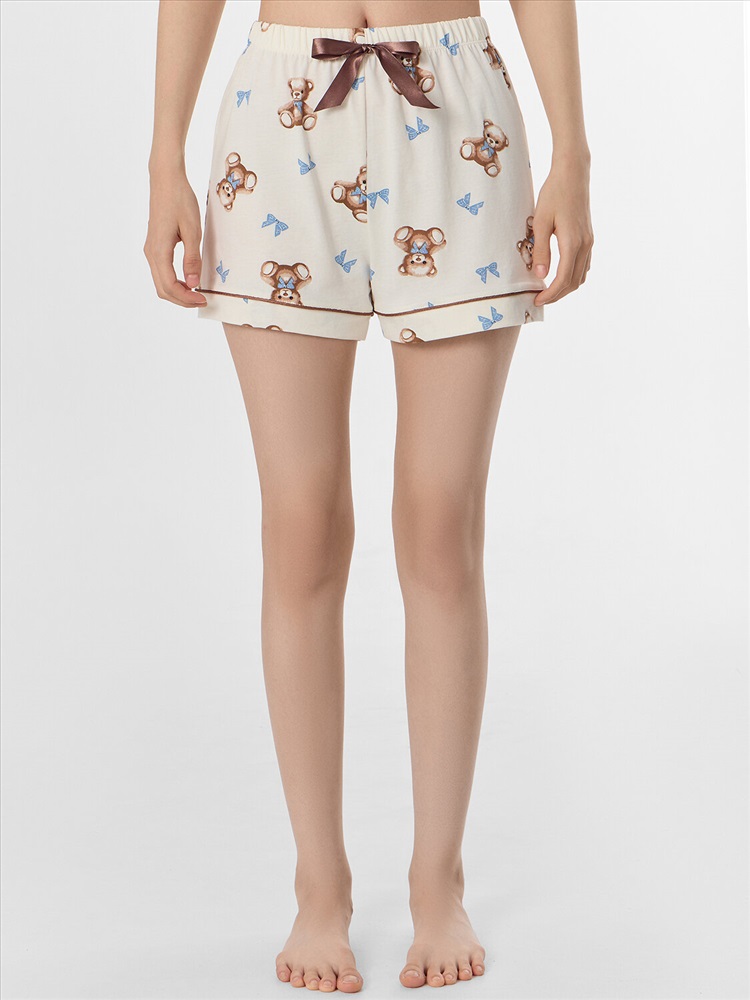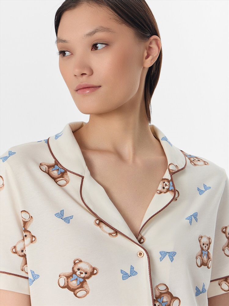 Пижама для женщин включает элегантную рубашку с отложным воротником и короткими рукавами. Особый шарм модели придают контрастные канты на воротнике, рукавах и передней части. Свободные шорты длины мини с резинкой и атласной тесьмой, завязывающейся на бантик, дополняют образ.