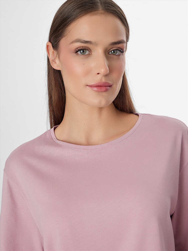 Верхняя часть выполнена из комбинации модала и хлопка — материалов, известных своей шелковистой мягкостью и прочностью. Бриджи выполнены из вискозы, которая обеспечивает идеальную воздухопроницаемость и нежность прикосновения к коже. Такой состав гипоаллергенен, отлично сохраняет цвет и форму после стирок, делая пижаму идеальной для ежедневного использования. Комплект станет любимым вариантом для спокойного сна, уютных вечеров с книгой или неспешных утренних ритуалов.