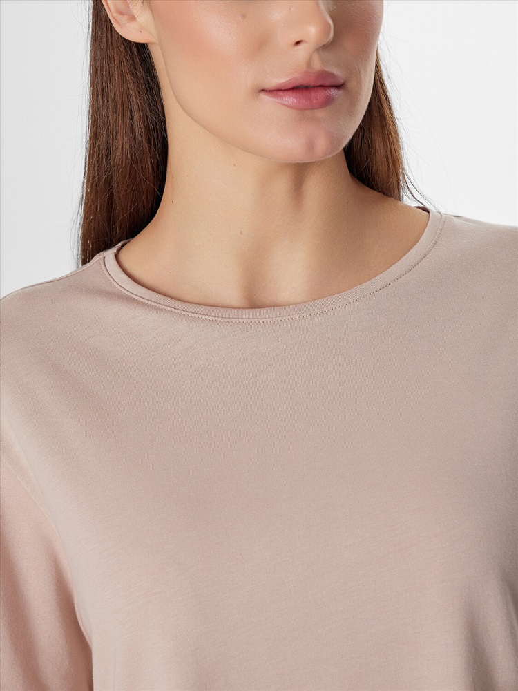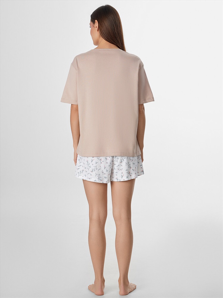 Домашняя пижама — это нежность, воплощенная в каждой детали. Набор из футболки и шорт создан для моментов, когда хочется раствориться в мягкости и комфорте. Футболка свободного кроя с овальной горловиной обволакивает тело легкостью, а короткие рукава оставляют ощущение свободы.