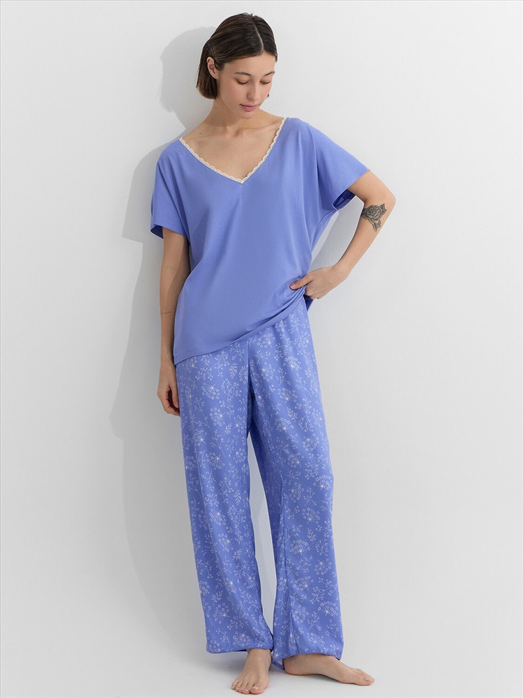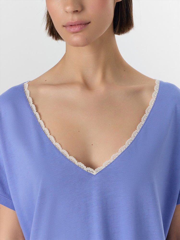 Комплект женский состоит из футболки и бридж. Футболка свободного силуэта. Горловина V-образная с отделькой из кружева, по спинке обтачка из основного полотна. Рукав короткий. Нижний срез футболки и рукавов обработан швом в подгибку.