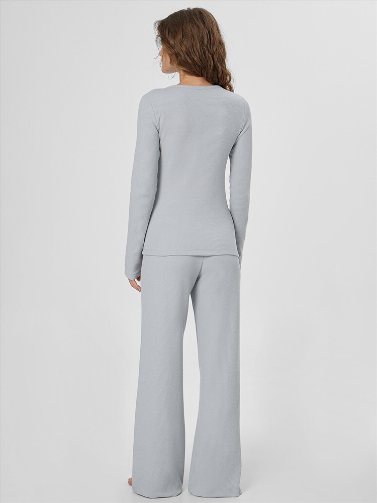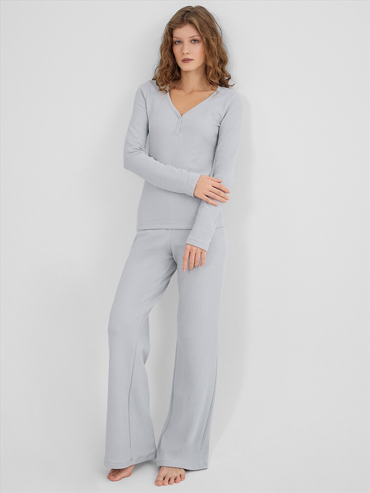 Домашняя пижама для женщин, состоящая из джемпера и брюк, создает гармоничный образ для уютного отдыха. Приталенный джемпер с изящным V-образным вырезом мягко подчеркивает силуэт, а длинные рукава обеспечивают комфорт. Элегантную деталь добавляет застежка на кнопки по переду, которая не только функциональна, но и становится стильным акцентом.