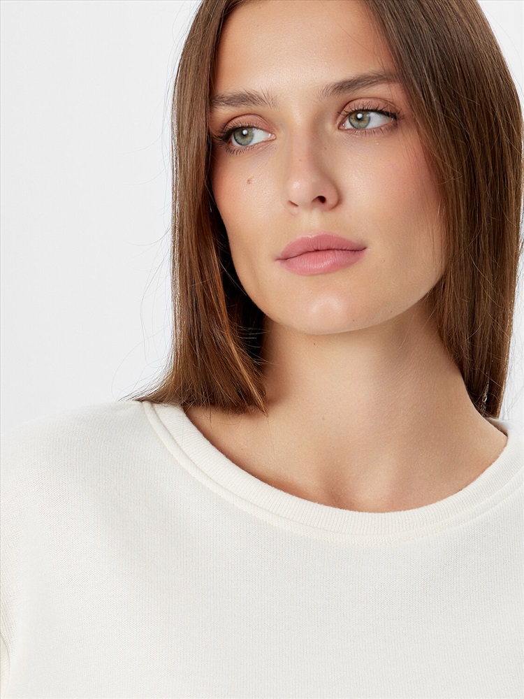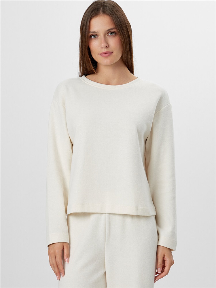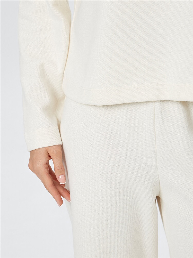 Комплект женский состоит из джемпера (502872) и брюк (532253). Джемпер домашний женский прямого силуэта. Горловина круглой формы, обтачка из основного полотна. Плечо слегка спущено. Рукав втачной, длинный. Нижний срез джемпера обработан швом вподгибку. Брюки с посадкой на талии, свободного силуэта. Пояс цельнокроеный с эластичной тесьмой внутри (внутр. 40мм 40RV). Нижний срез обработан швом в подгибку.