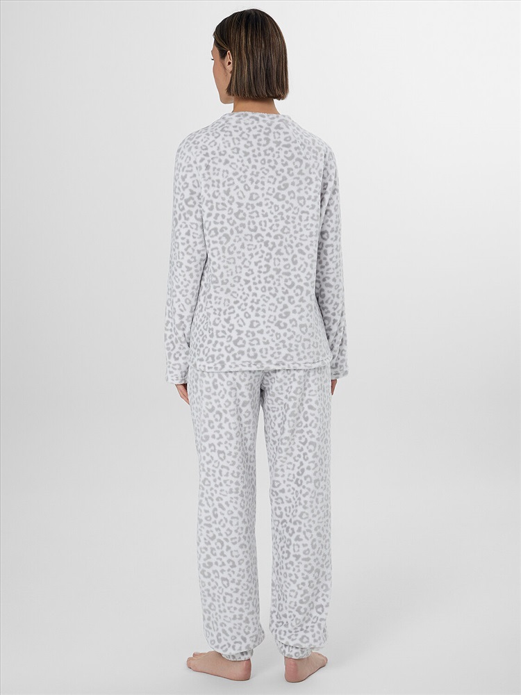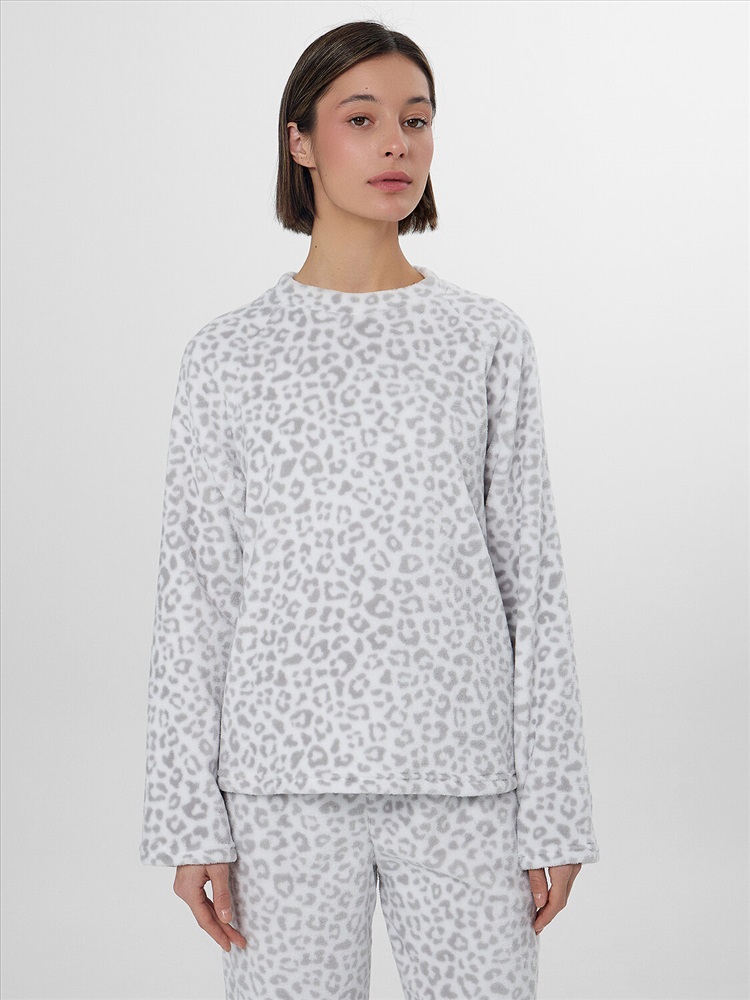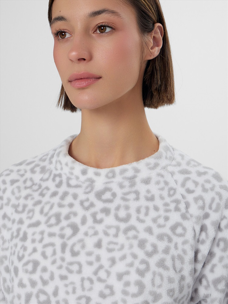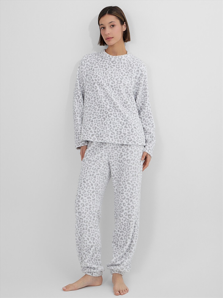 Свободный джемпер прямого кроя с круглой горловиной и длинными рукавами реглан обеспечивает полную свободу движений. Брюки со средней посадкой на мягком поясе с широкой резинкой удобно сидят по фигуре. Слегка зауженные к низу, они завершаются эластичной тесьмой для идеальной посадки, не стесняя движений во время сна или отдыха.