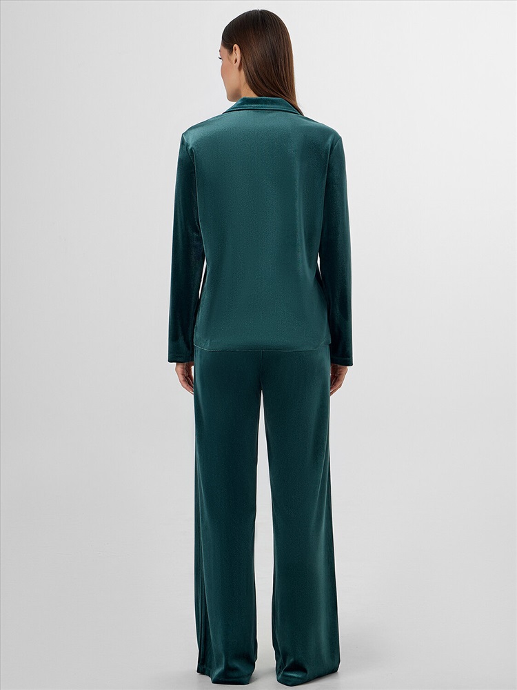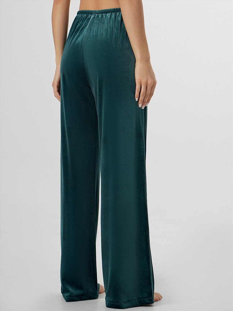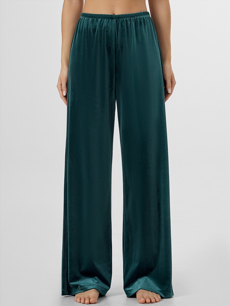 Жакет прямого силуэта. Горловина V-образной формы с отложным воротником и лацканами. По переду обработана центральная застежка на петли и пуговицы (D10 мм). Рукава втачные длинные. Нижний срез жакета и рукавов обработан швом вподгибку. Брюки прямые, свободные. Посадка средняя. Пояс цельнокроеный с эластичной тесьмой внутри (внутр. 20мм 20RV). Нижний срез брюк обработан швом вподгибку