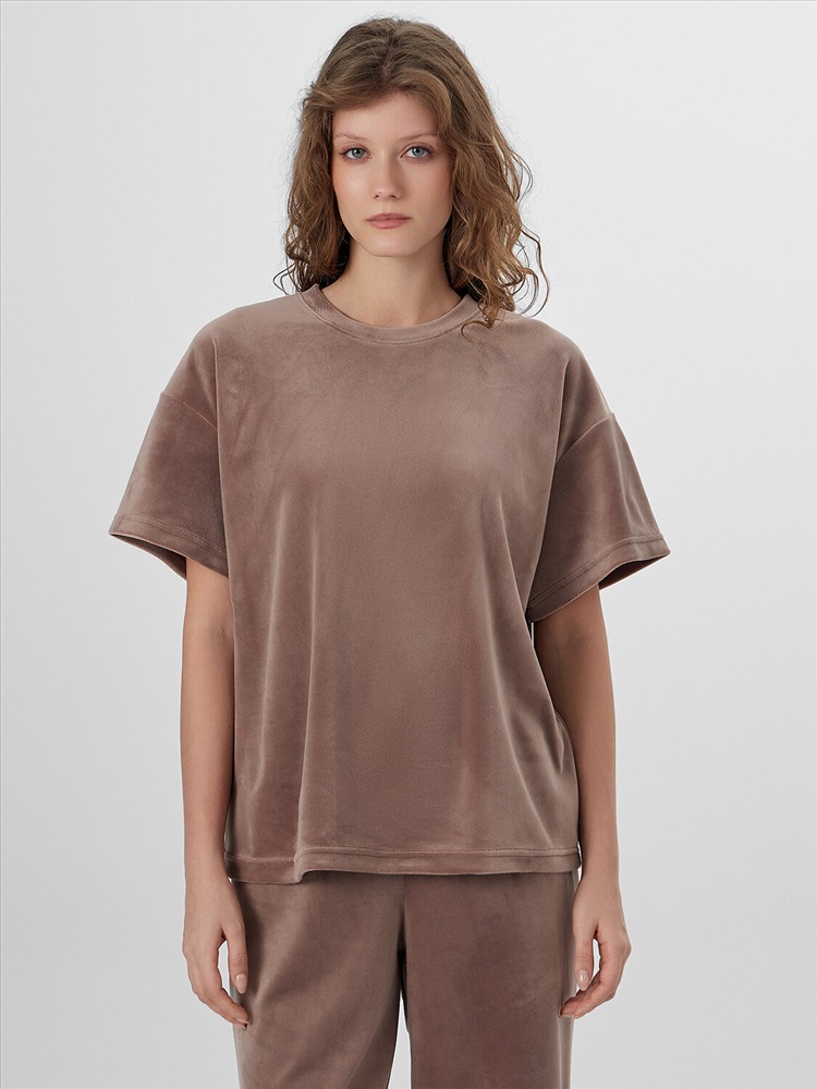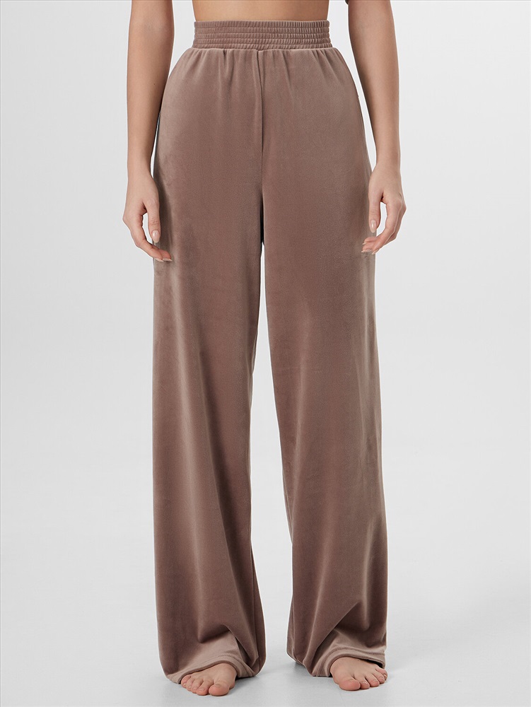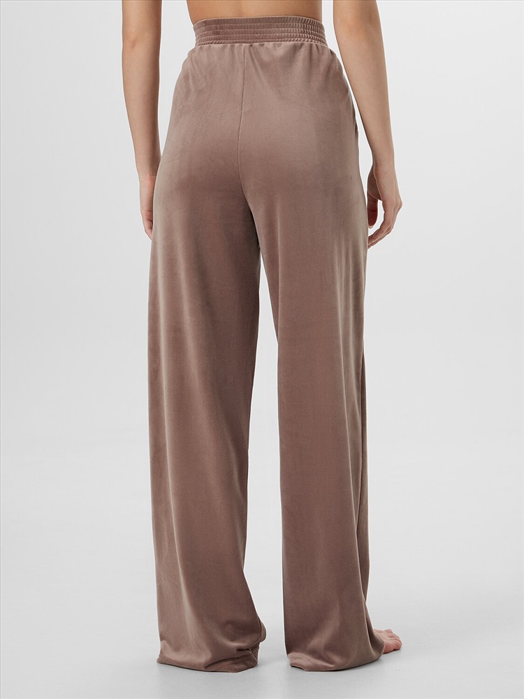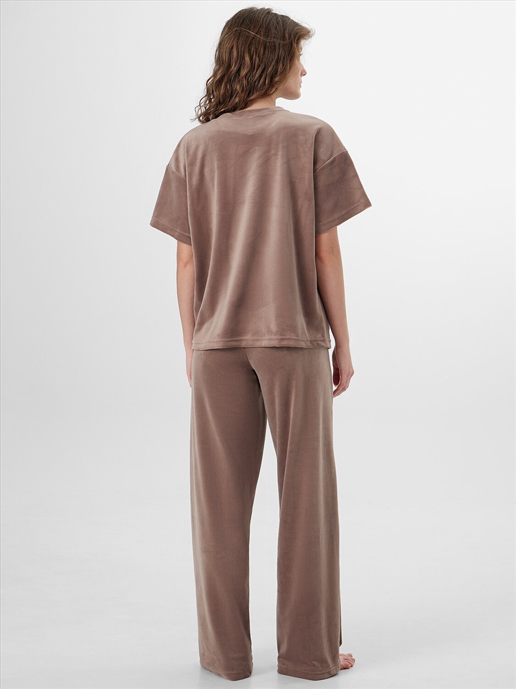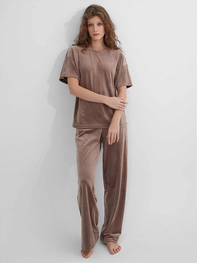 Джемпер прямого кроя с круглой горловиной и короткими рукавами не сковывает движения, а аккуратная обработка швов гарантирует комфорт. Брюки с высокой посадкой и широким эластичным поясом мягко фиксируются на талии, а практичные карманы-«хулиганы» добавляют функциональности.