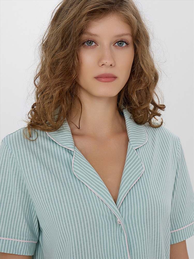 Комфортная пижама женская в "костюмном стиле" из высококачественного хлопка для приятных снов и домашних дел. Жакет прямой, с отложным воротником и лацканами, короткими рукавами, застегивается на пуговицы. Дополняют его свободные шорты длины мини, с резиновой тесьмой в поясе и атласной тесьмой, которая завязывается на бантик. Особенность модели – контрастные канты на рукавах, воротнике и передней части рубашки. В пижаме абсолютно не жарко, комфортный материал не сковывает движений. Красивая и интересная модель на каждый день. В линейке много актуальных расцветок, широкий размерный ряд, есть варианты для девушек с пышными формами plus-size. Лучший выбор домашней одежды на каждый день от Mark Formelle. Рекомендуем!