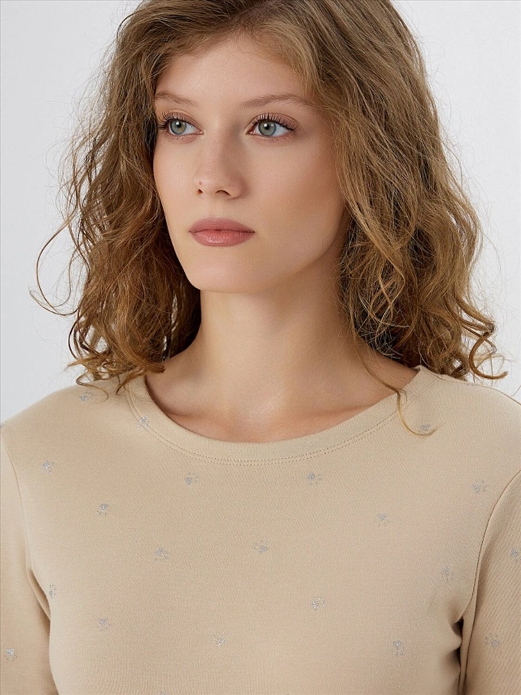 Особое внимание уделено деталям: края рукавов и подол аккуратно обработаны прочной двойной строчкой. Такая обработка гарантирует, что швы останутся гладкими и эластичными даже после многих стирок.