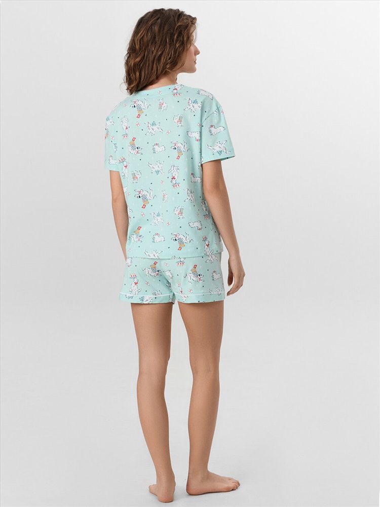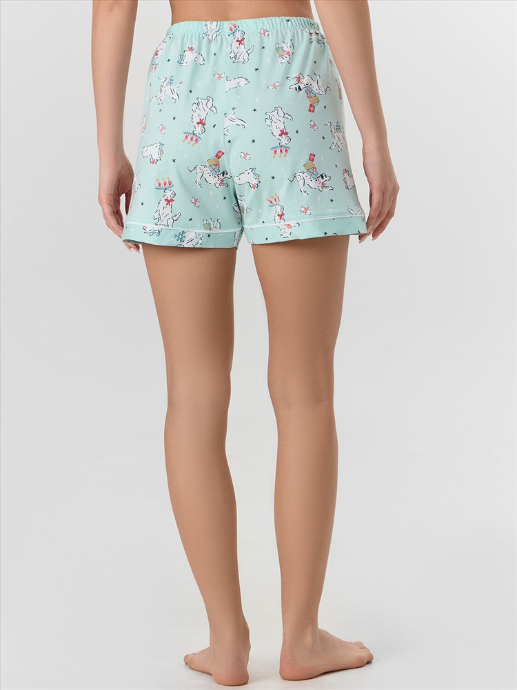 Рубашка с отложным воротником и короткими рукавами застегивается на аккуратные пуговицы. Свободные шорты с эластичным поясом бережно облегают талию, не стесняя движений во время отдыха или домашних дел.