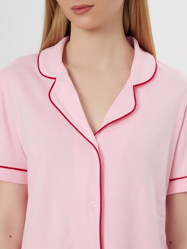 Хлопковый женский комплект актуального свободного силуэта. Рубашка прямая, с отложным воротником и лацканами, короткими рукавами, застегивается на пуговицы. Дополняют ее свободные шорты длины мини, с резиновой тесьмой в поясе и атласной тесьмой, которая завязывается на бантик. Особенность модели – контрастные канты на рукавах, воротнике и передней части рубашки. Рекомендуем для сна, отдыха и домашних дел!