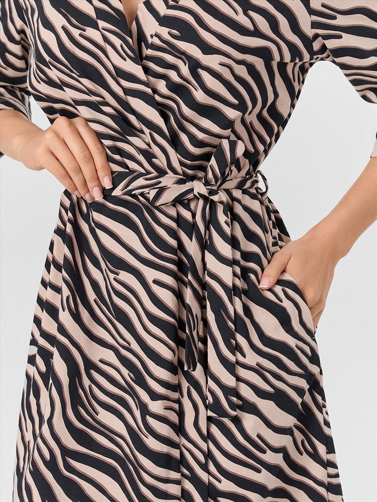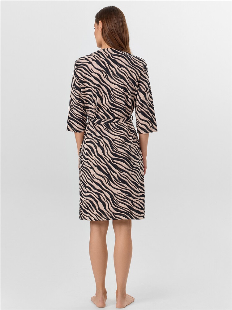 Укороченные рукава 3/4 и удобные боковые карманы добавляют практичности, а пояс на талии позволяет регулировать посадку по фигуре. Глубокие проймы обеспечивают полную свободу движений, делая пеньюар особенно удобным для утренних ритуалов или отдыха после душа.