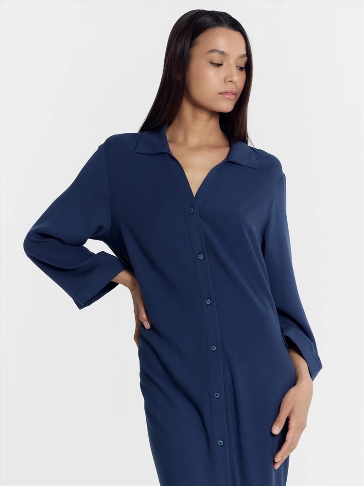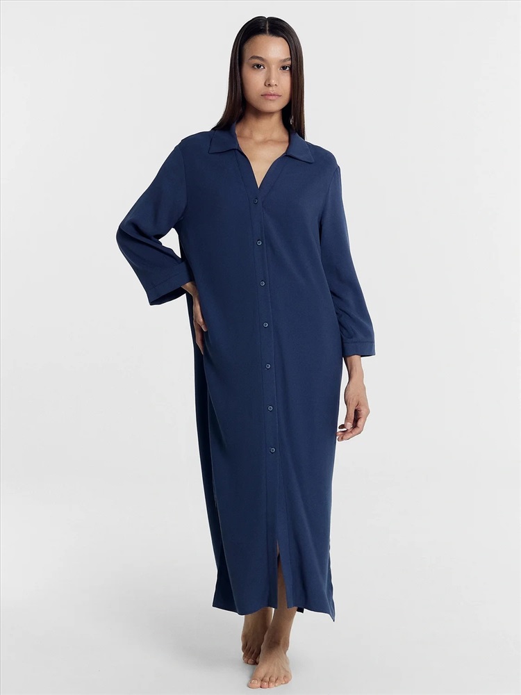 Платье женское домашнее прямого силуэта. Перед с центральной застежкой и отрезной планкой на пуговицах . Горловина V-образной формы, в горловину втачан воротник отложной. Рукав 7/8 укорочен, втачной. По низу рукава отрезная манжета. Нижний срез платья обработан швом вподгибку. Платье длиной ниже колена, в боковых швах обработаны разрезы.
