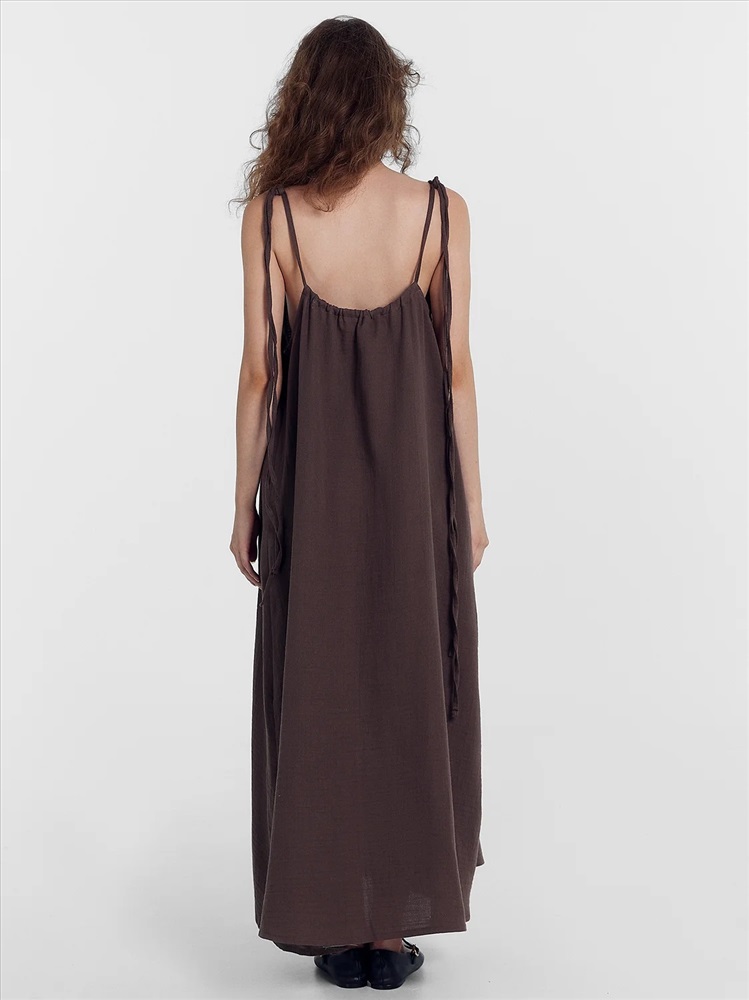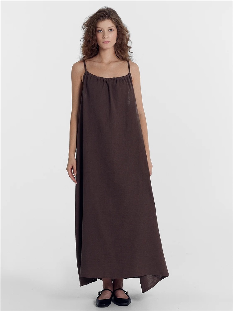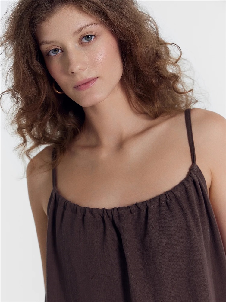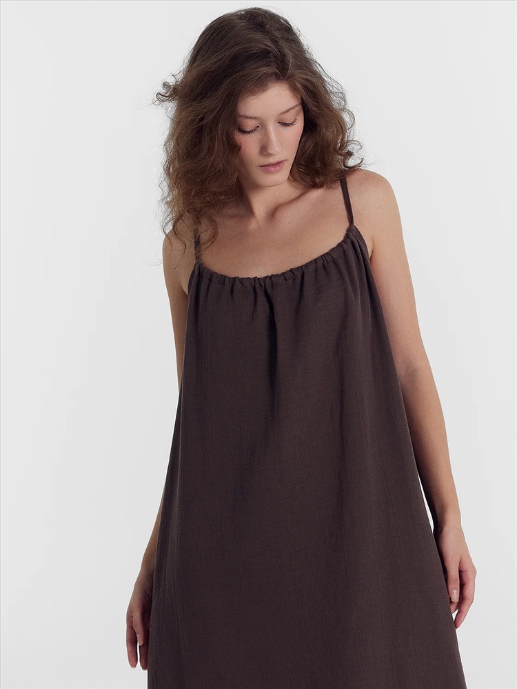 Сарафан женский свободного силуэта из ткани, муслин. Горловина с кулиской, присборена. В кулису протянута бейка, образующая бретели. Бретели завязываются на бантик. Низ сарафана застрочен швом в подгибку.