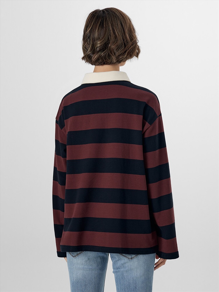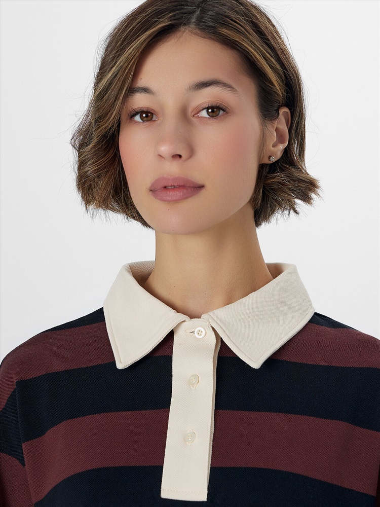 Поло прямое, свободное. Рукава втачные длинные, плечо спущено. Перед с застежкой "поло". Верхняя планка отрезная. Застежка на 3 петли и пуговицы (D 10мм). Воротник из основного полотна. Шов втачивания воротника закрыт бейкой из основного полотна. Низ поло и рукавов обработан швом вподгибку.