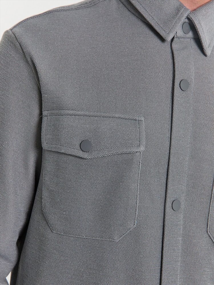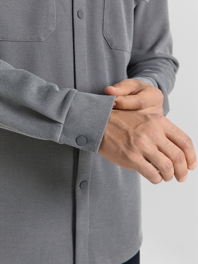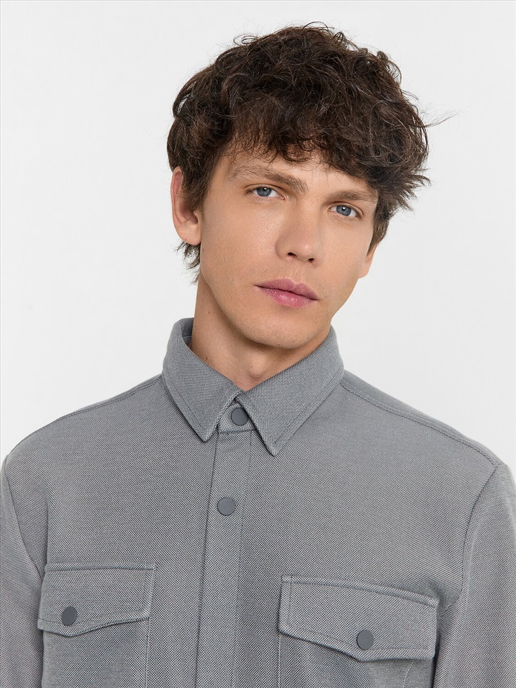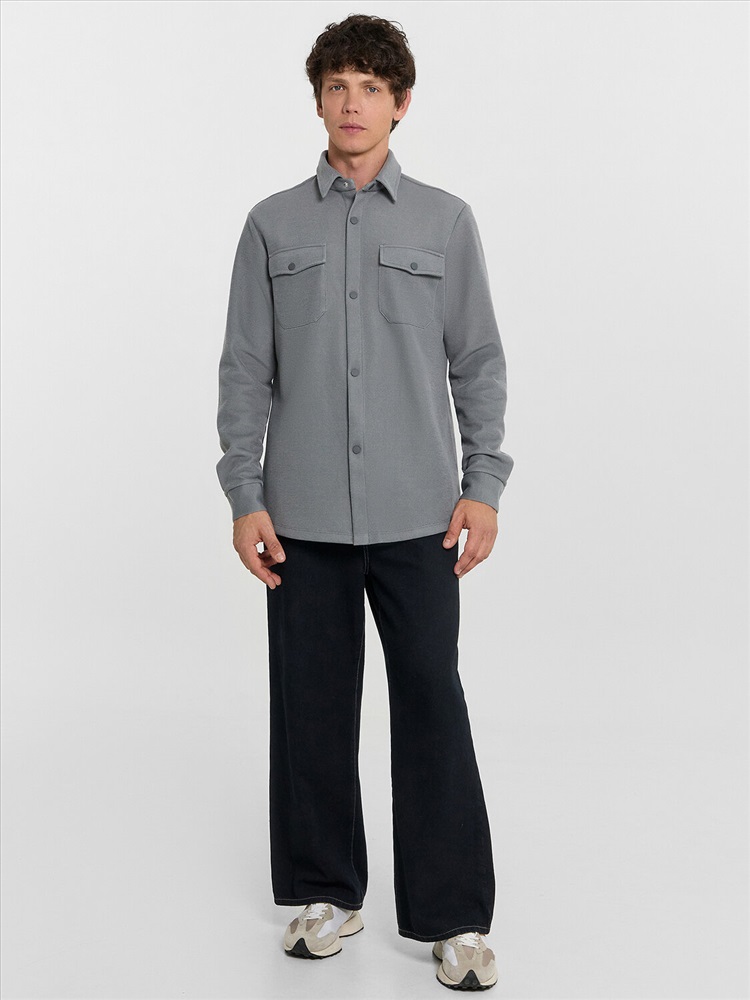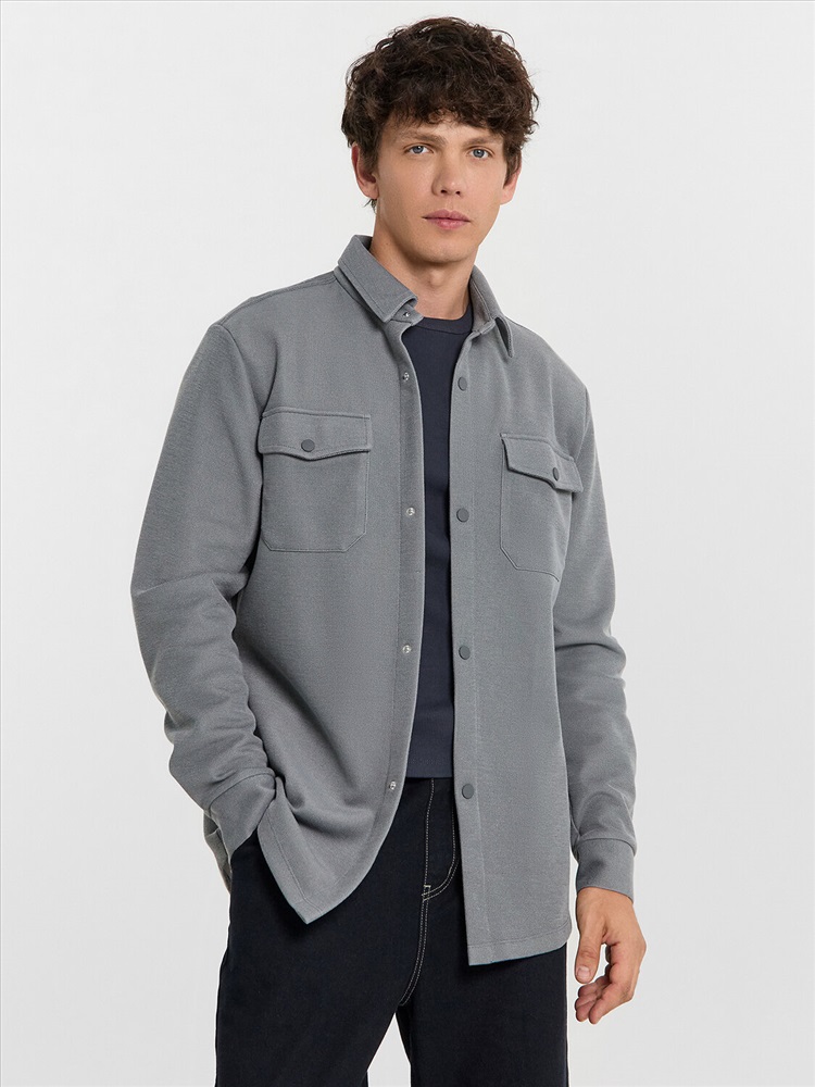 Мужская рубашка из трикотажного интерлока в стиле жакета — это удобная и стильная вещь, идеально подходящая для повседневной носки. Свободный силуэт придает образу расслабленность и не стесняет движения, а плотный и мягкий материал обеспечивает комфорт и практичность. Горловина оформлена рубашечным воротником, который добавляет строгости и завершенности. Застежка на кнопках по центру делает модель современной и удобной в использовании. Спереди расположены накладные карманы, создающие акцент и усиливающие практичность. Спущенная линия плеча подчеркивает стильную неформальность кроя, а длинные рукава с манжетами на кнопках вносят легкий элемент делового стиля. Нижний край изделия аккуратно обработан швом вподгибку, что добавляет аккуратности. Такое сочетание деталей делает рубашку универсальной — ее можно носить как самостоятельно, так и поверх футболки или водолазки.