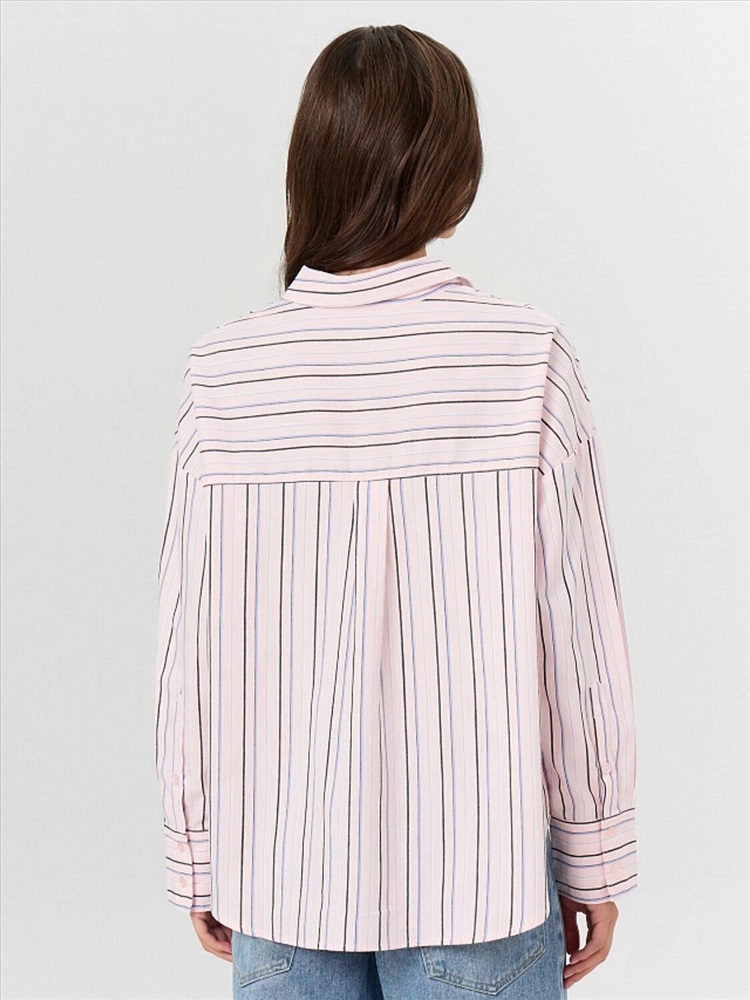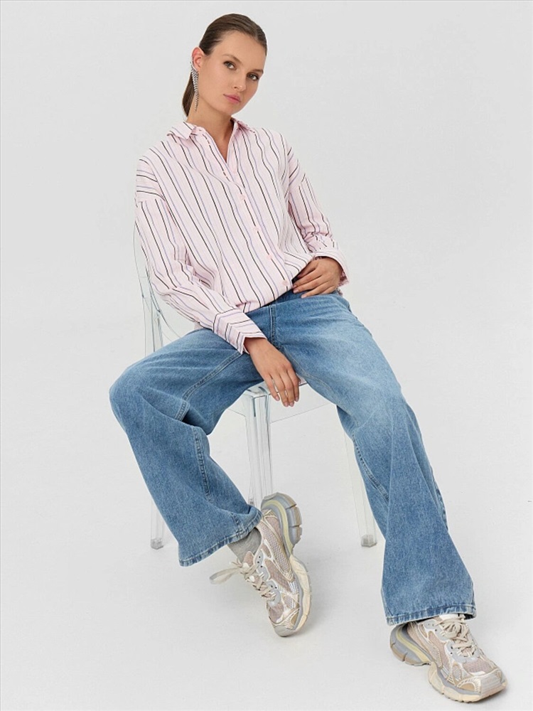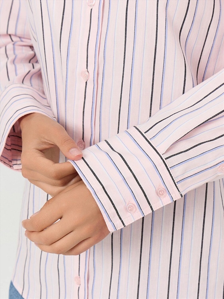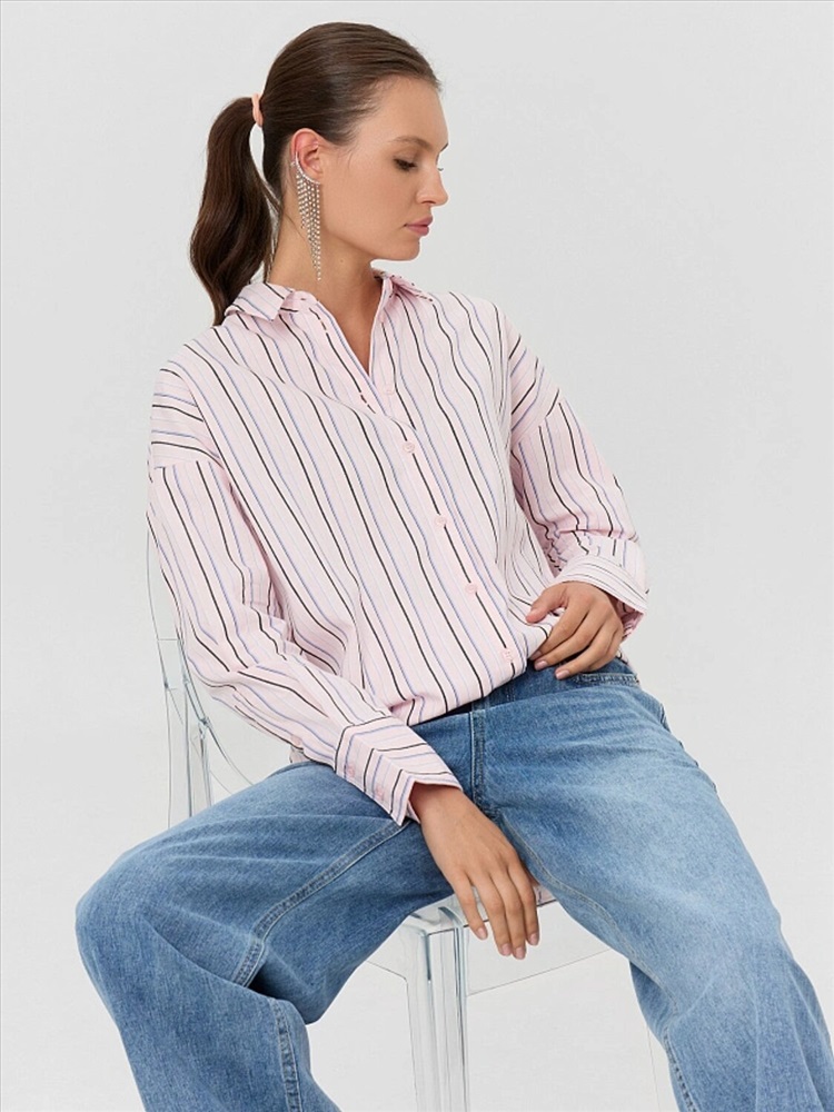 Свободный крой не сковывает движений, а тонкие вертикальные полосы визуально вытягивают силуэт, добавляя образу легкости. Женская рубашка легко сочетается с классическими брюками, джинсами или юбкой, делая её идеальным вариантом для офиса, прогулок или встреч с друзьями. Круглая горловина плавно переходит в отложной воротник, создавая гармоничный и утончённый силуэт.