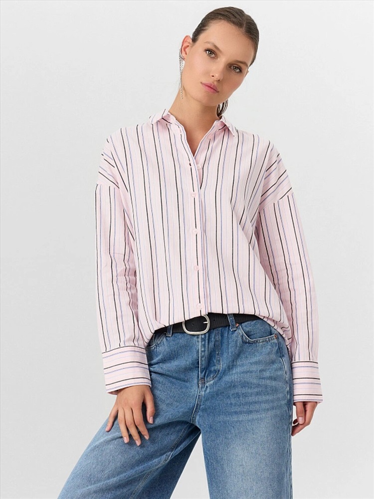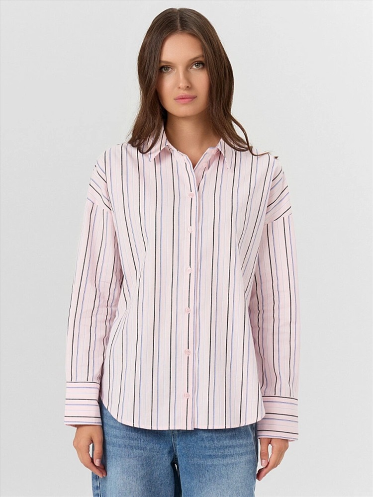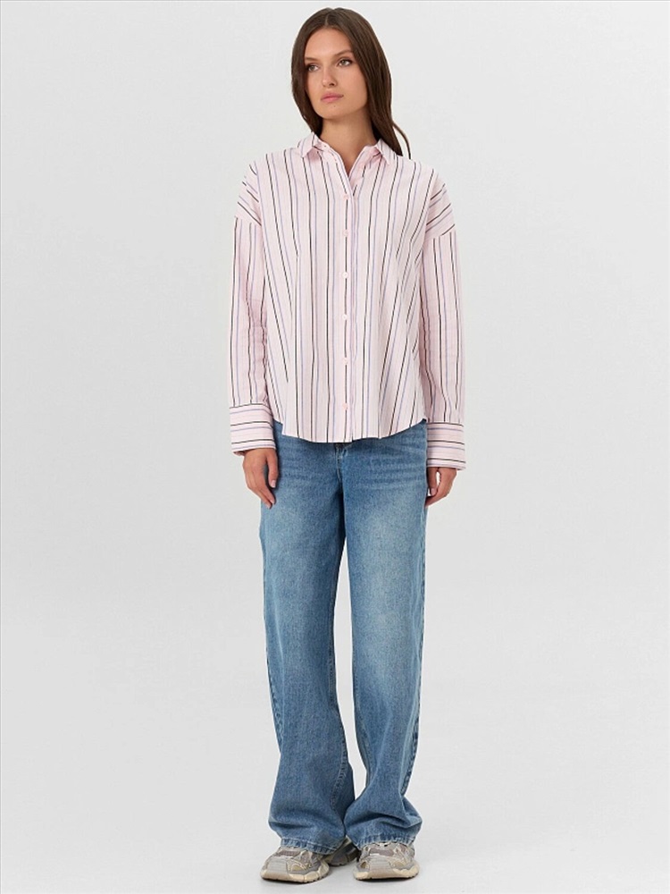 Женская рубашка свободного силуэта в нежном оттенке — универсальная основа для стильных повседневных образов. Изделие выполнено из хлопка, который обеспечивает комфорт в течение всего дня, позволяя коже дышать и сохраняя идеальную посадку. Рубашка с длинным рукавом дополнена аккуратным отложным воротником, придающим образу элегантность, и регулируемыми манжетами для индивидуальной посадки.