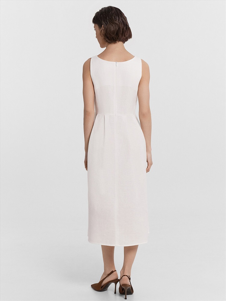 Стильный сарафан миди, выполненный из премиального льна и хлопка, станет прекрасным дополнением вашего гардероба. Модель на бретелях отличается слегка прилегающим силуэтом, который акцентирует внимание на талии, подчеркивая вашу фигуру. А вырез горловины каре и рельефные швы по передней части придают сарафану элегантный и изысканный вид. Застежка на потайную молнию на спинке обеспечивает удобство при надевании и снятии. Этот красивый и комфортный сарафан идеально подходит для теплого времени года, сочетая в себе стиль и комфорт. Отличный выбор для тех, кто ценит качество и элегантность в одежде!