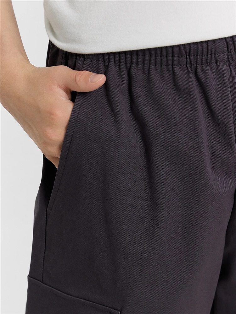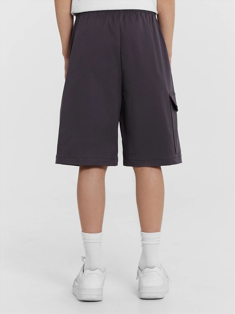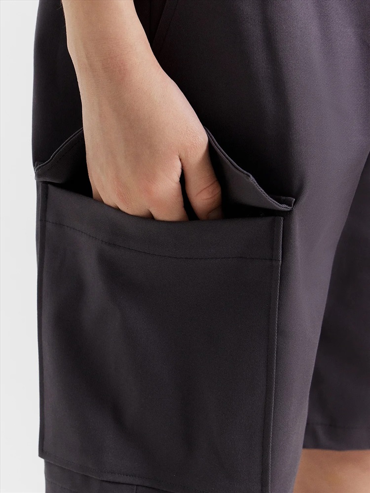 Шорты карго прямого силуэта из текстильного полотна. Посадка средняя. Длина выше колена. Пояс цельнокроеный с эластичной тесьмой и шнуром внутри. По поясу выполнены три декоративные строчки. На передних деталях брюк настрочен один карман с клапаном, обработаны карманы с наклонным входом от боковых швов. Низ изделия обработан швом в подгибку.